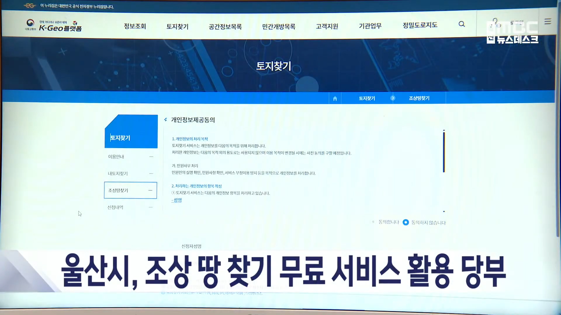 울산시가 '조상 땅 찾기' 서비스에 대한 시민들의 적극적인 활용을 당부했습니다.이 서비스는 본인이나 조상 소유의 토지를 찾지 못할 경우 지적공부에 등록된 전국 토지 소유현황을 조회해 정보를 제공하는 무료 행정서비스입니다.울산시는 지난해 조상 땅 찾기 서비스를 통해 3천548명에게 1만1천876필지의 토지정보를 제...
