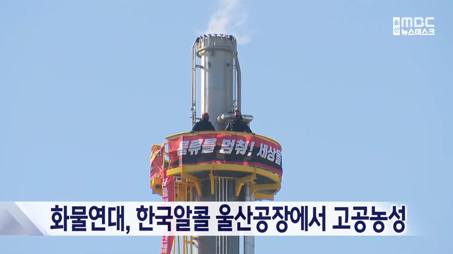 민주노총 공공운수노조 화물연대 소속 조합원 2명이, 한국알콜산업 울산공장 연소탑에서 고공 농성을 벌이고 있습니다.이들은 오늘(2/17) 오전 3시쯤 사다리를 이용해 담장을 넘은 뒤, 경비원을 따돌리고 55m 높이의 굴뚝에 오른 것으로 확인됐으며, 조합원들은 비조합원을 폭행한 혐의로 기소돼 퇴사한 조합원의 복직 등을...