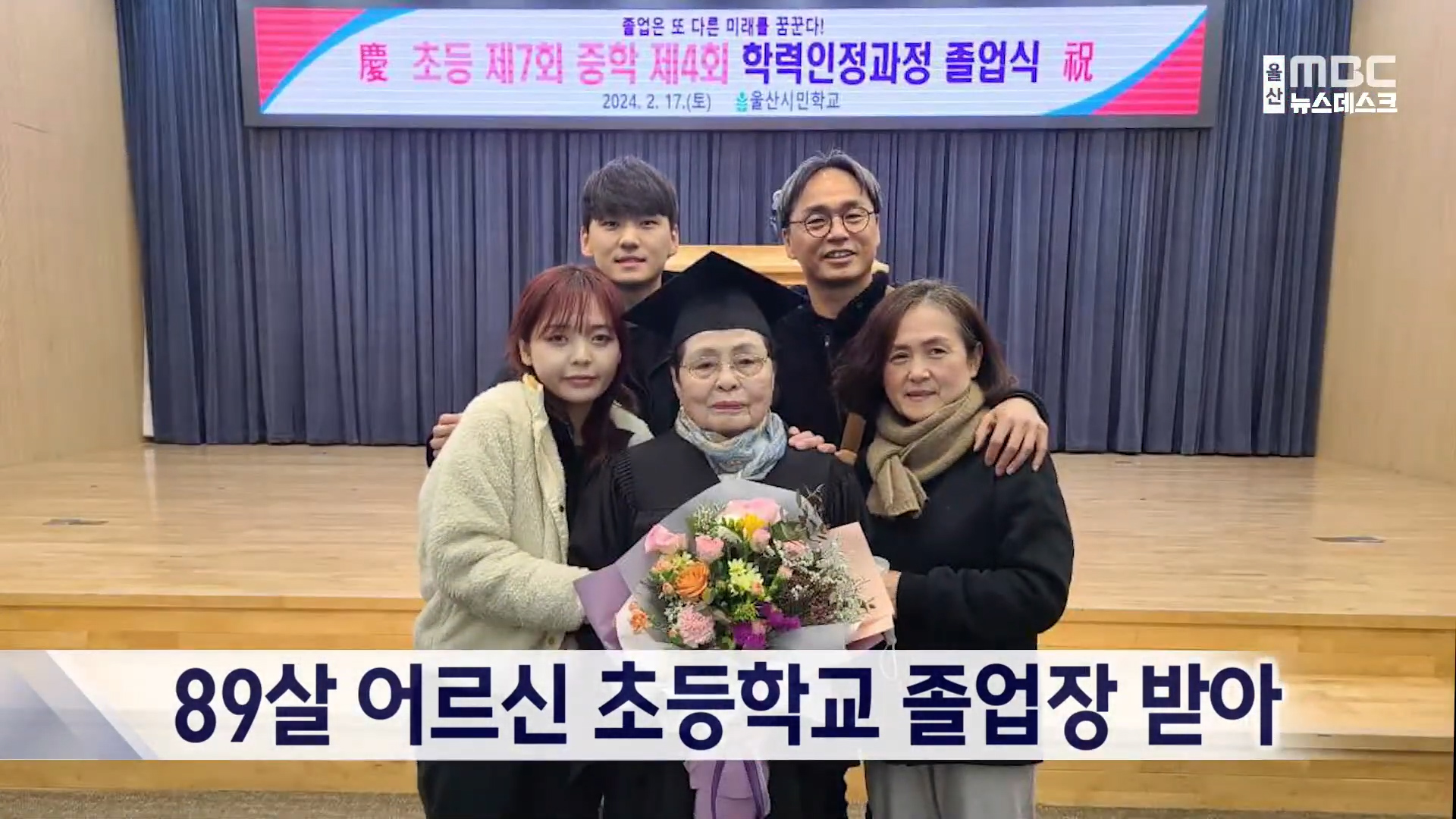 학교 최고령자인 89살 안병일씨가 오늘(2/17) 중구청 대강당에서 열린 졸업식에서 초등학교 졸업장을 받았습니다.안씨는 2022년 울산시민학교에 입학해 주 3일 진행되는 수업을 2년동안 하루도 빠지지 않고 참여했습니다.중구에서 40년동안 식당을 운영해온 안씨는 식당 동료의 권유로 공부를 시작했는데 읽고 쓰는 일을 계...