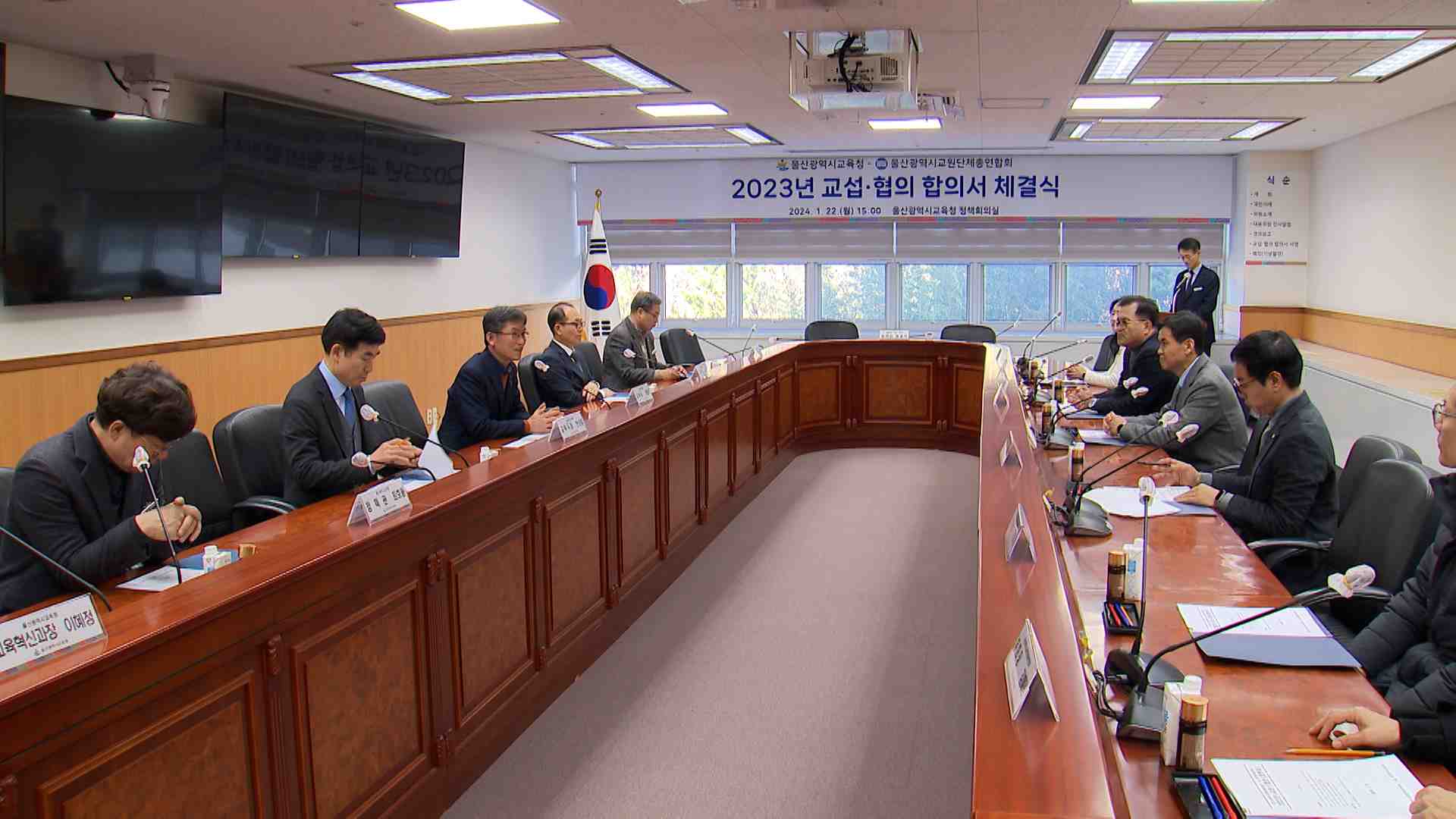 울산시교육청과 울산교총이 오늘(1/22) '2023년 교섭 합의서 체결식'을 갖고 117개 조항에 대해 합의했습니다. 주요 합의사항을 보면 교육활동 보호를 위해 1대 1법률지원단을 운영하고 유치원 방과 후 과정 운영을 내실화하기로 했습니다. 또 담임수당은 13만원에서 20만원으로 인상하고, 보직수당은 7만원에서 15만원으로...