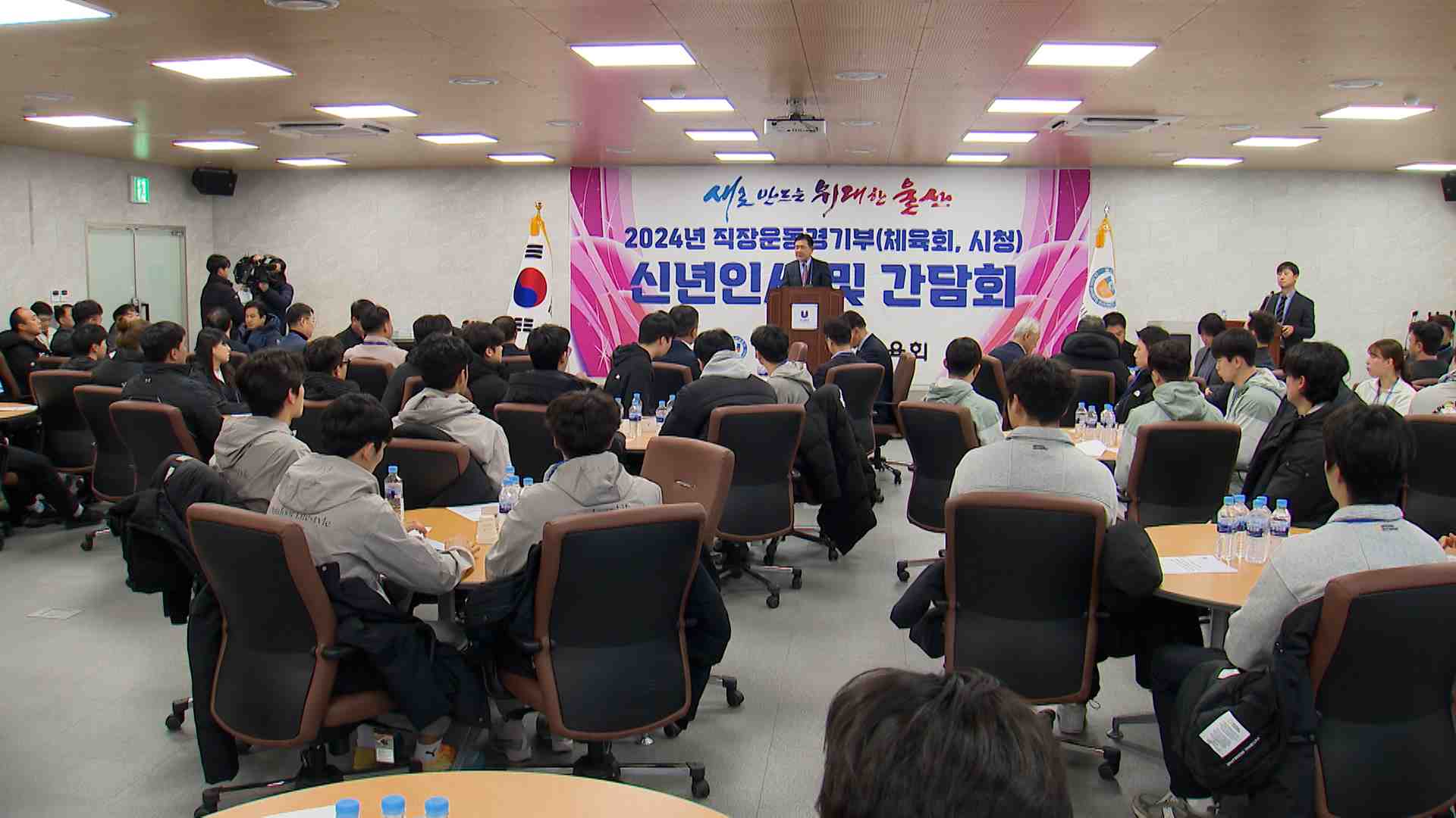 울산시체육회가 오늘(1/22) 울산종합운동장 대회의실에서 신년 인사회를 갖고 올해 필승을 다졌습니다. 인사회에는 울산시체육회 선수와 지도자 100여명이 참석했으며, 올해 있을 파리올림픽을 비롯해 전국체전 등 대회에서 좋은 성적을 내겠다는 다짐을 밝혔습니다.