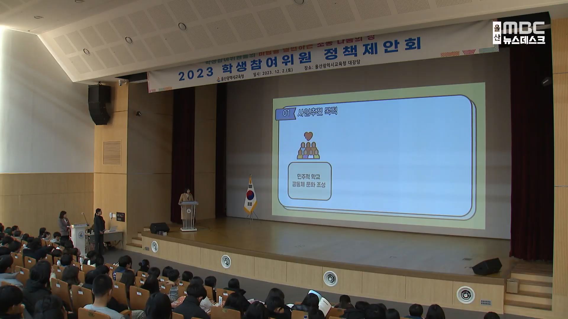 울산의 청소년 자치기구인 학생참여위원회가 오늘(12/2) 울산시교육청에서 정책제안회를 열었습니다.강남고등학교 이은우 학생은 짧은 영상인 이른바 '숏폼' 중독 예방 사업을, 현대청운중학교 김도희 학생은 미래를 위한 실용적 진로 교육을 진행해 달라고 요청했습니다.이밖에 초등학생이 바라는 수학여행과 체험활동, 교...