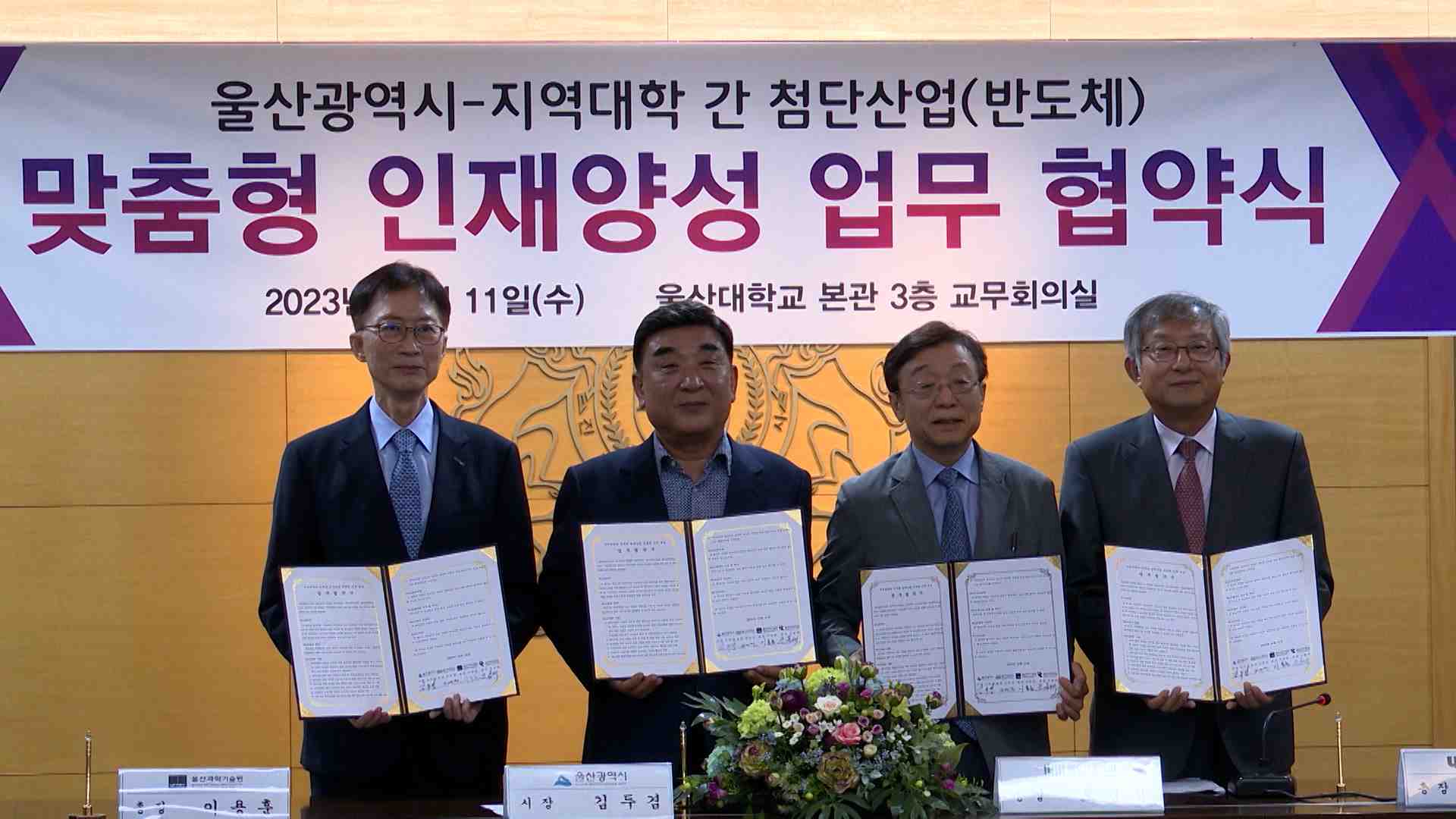 울산시와 울산대, 유니스트, 울산과학대가 오늘(10/11) 울산대에서 반도체 맞춤형 인재육성을 위한 업무협약을 체결했습니다.울산시는 반도체 인재양성을 위해 행정적인 지원에 나서기로 했으며 지역 대학 3곳은 전문학사와 학사, 석박사로 이어지는 인재육성 성장경로를 개발하는 등 상호 협력하기로 했습니다.울산시는 올...