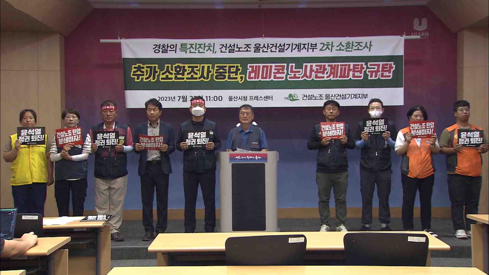 민주노총 건설노조 울산건설기계지부가 울산경찰에 추가 소환조사를 중단해 달라고 요구했습니다. 노조는 경찰이 지난 6월 조합원 12명에 대한 소환조사를 마쳤음에도 다시 건설노조 부울경본부장과 건설기계지부 수석부지부장에 대해 추가소환을 통보했다며 이 같이 주장했습니다. 노조는 또 건설현장 단체협약 체결과 관...