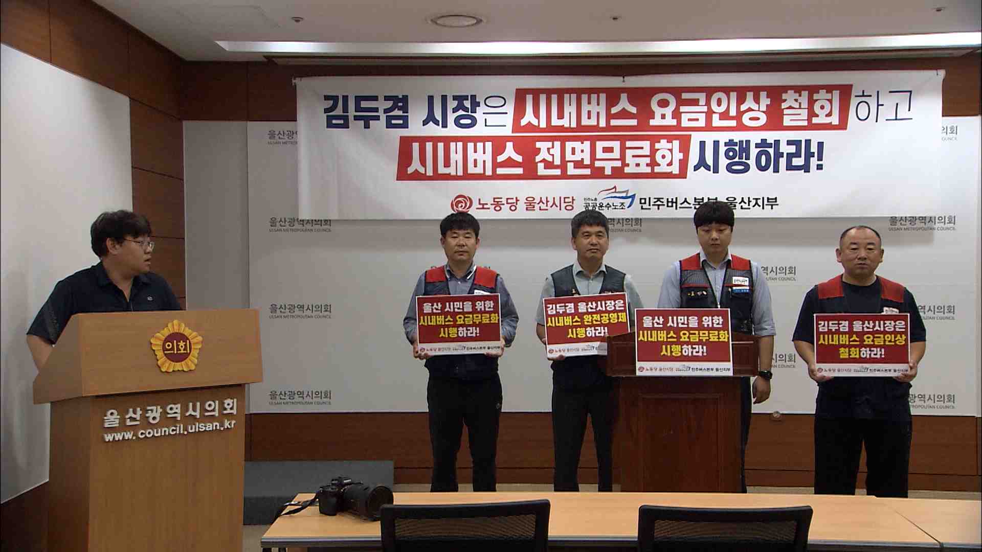 민주버스 울산지부와 노동당 울산시당은 오늘(6/28) 울산시의회 프레스센터에서 기자회견을 갖고 다음달 4일 열리는 울산시물가위원회는 시내버스 요금 인상을 중단하라고 요구했습니다. 이들은 버스요금이 250원 오르면 가계와 물가에 부담이 된다며 장기적으로 세종시와 충청남도처럼 시내버스 요금 무료화를 시행해야 한...