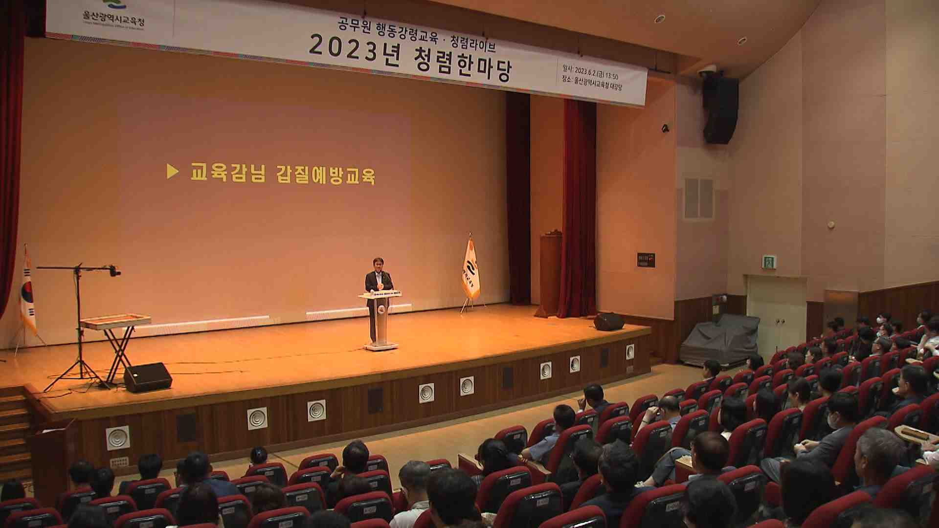천창수 울산교육감이 오늘(6/2) 간부공무원을 대상으로 한 갑질 예방교육에 직접 강사로 나섰습니다. 천 교육감은 갑질 예방을 위해서는 청렴과 소통, 존중, 공감의 덕목을 갖추고 수평적 조직문화를 만들어야 한다고 강조했습니다. 교육감이 직접 강사로 나선 것은 이례적인 일로 청렴한 조직 문화를 확고히 하겠다는 의지...