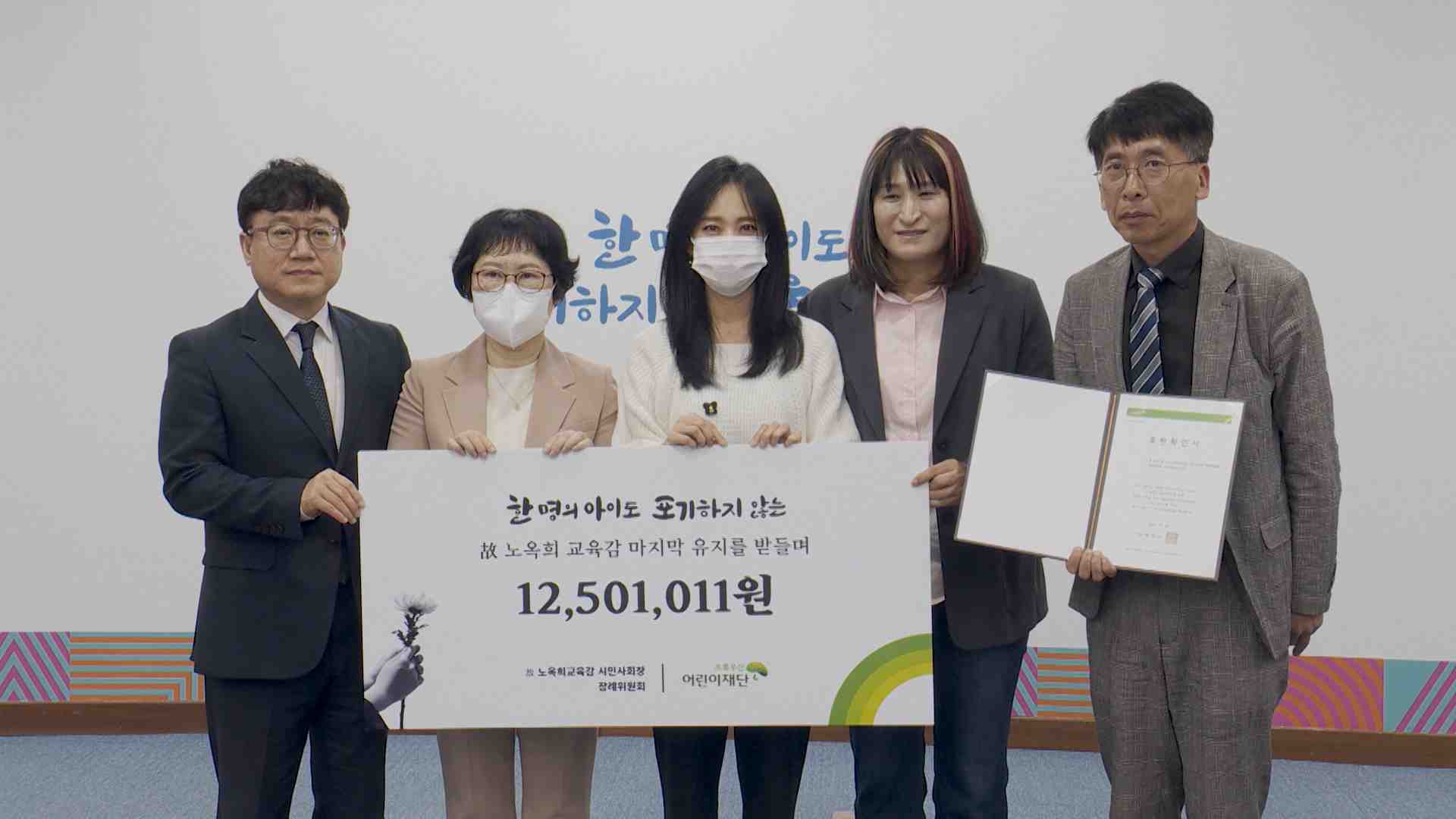 고 노옥희교육감 시민사회장례위원회는 오늘(5/3) 해산에 앞서 장례비용에 쓰고 남은 돈 천250여만원을 전액 기부했습니다. 장례비용은 고 노옥희 교육감을 추모하기 위해 시민들이 자발적으로 낸 돈으로 시민분향소 운영과 추모제 등에 쓰였습니다. 남은 돈은 초록우산 어린이재단을 통해 울산지역 저소득층 학생들의 생계...
