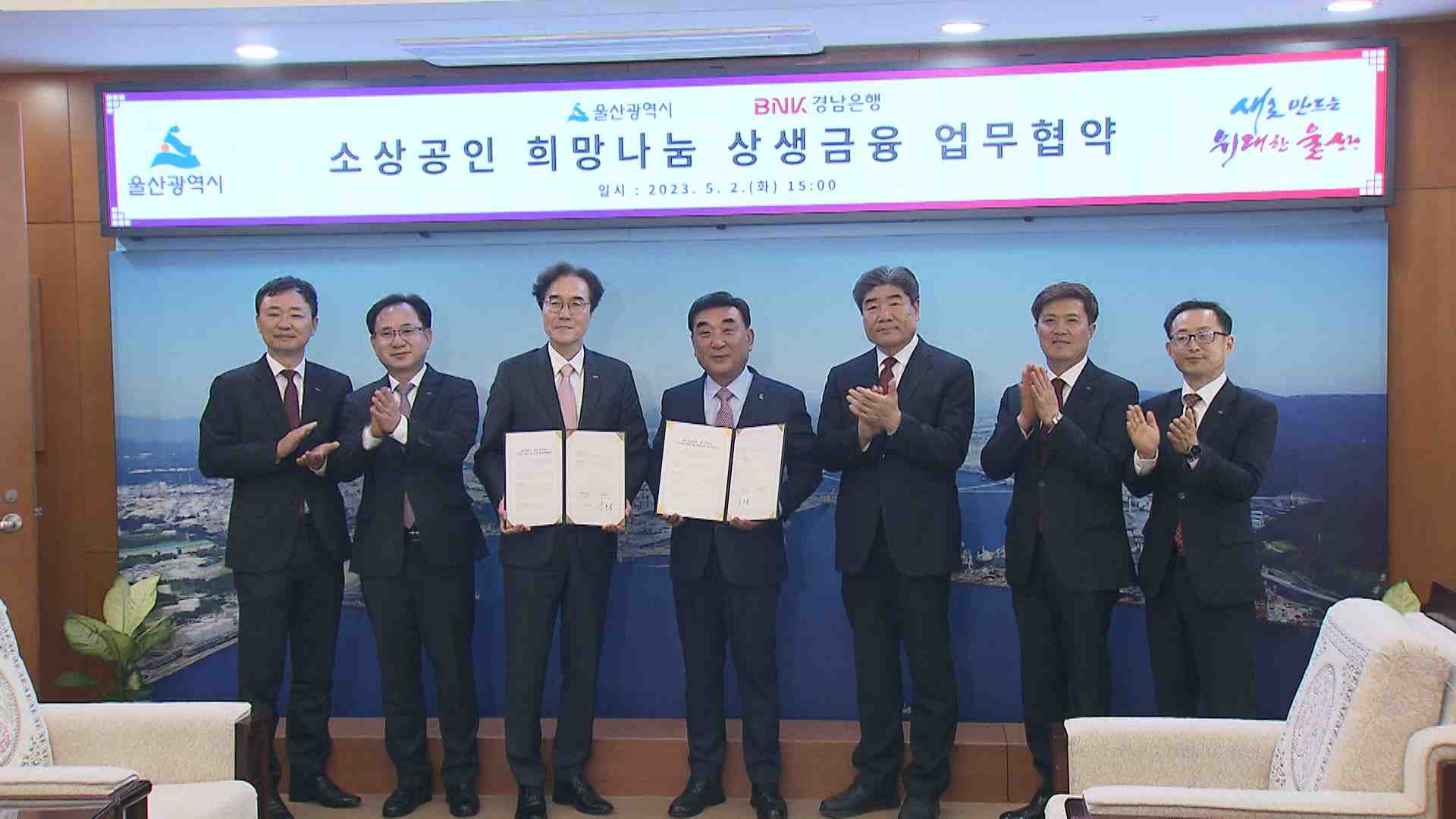 울산시와 BNK 경남은행이 지역 소상공인에게 저금리 특별대출을 지원하는 '소상공인 희망 나눔 상생금융' 협약을 체결했습니다. 협약에 따라 BNK 경남은행은 총 50억 규모의 자금을 지원하고, 연 소득 3천500만 원 이하 소상공인은 신용 등급과 무관하게 1천만 원 한도로 무담보 무보증 자금을 지원받을 수 있습니다.