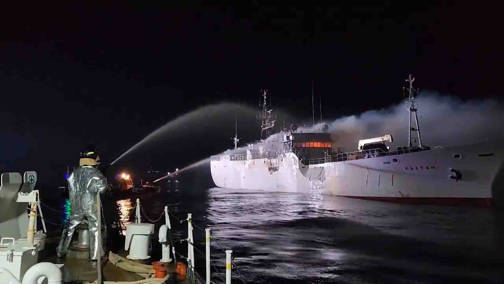 [앵커] 오늘 새벽 한국 해역을 항해하던 러시아 선박에서 불이 나 해경과 군이 강풍 속에서 대대적인 구조와 수색 작업을 벌였습니다. 사고 선박은 불이 꺼지지 않아 항구로 옮겨졌는데 실종됐던 러시아 선원 4명이 모두 숨진 채 발견됐습니다. 정인곤 기자입니다.[리포트] 한 치 앞도 보이지 않는 깜깜한 밤, 해경 화학 방...
