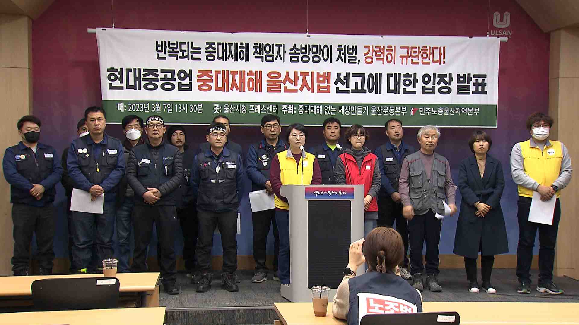민주노총 울산본부는 오늘(3/7) 울산시청 프레스센터에서 기자회견을 열고 지난 2021년 발생한 현대중공업 사망사고와 관련해 법원의 판결이 너무 가볍다고 주장했습니다. 이들은 지난 2021년 2월 발생한 철판에 끼어 노동자가 숨진 사고와 관련해서는 당시 조선사업부 대표에게 징역 6월에 집행유예 1년이 선고됐지만, 5월...