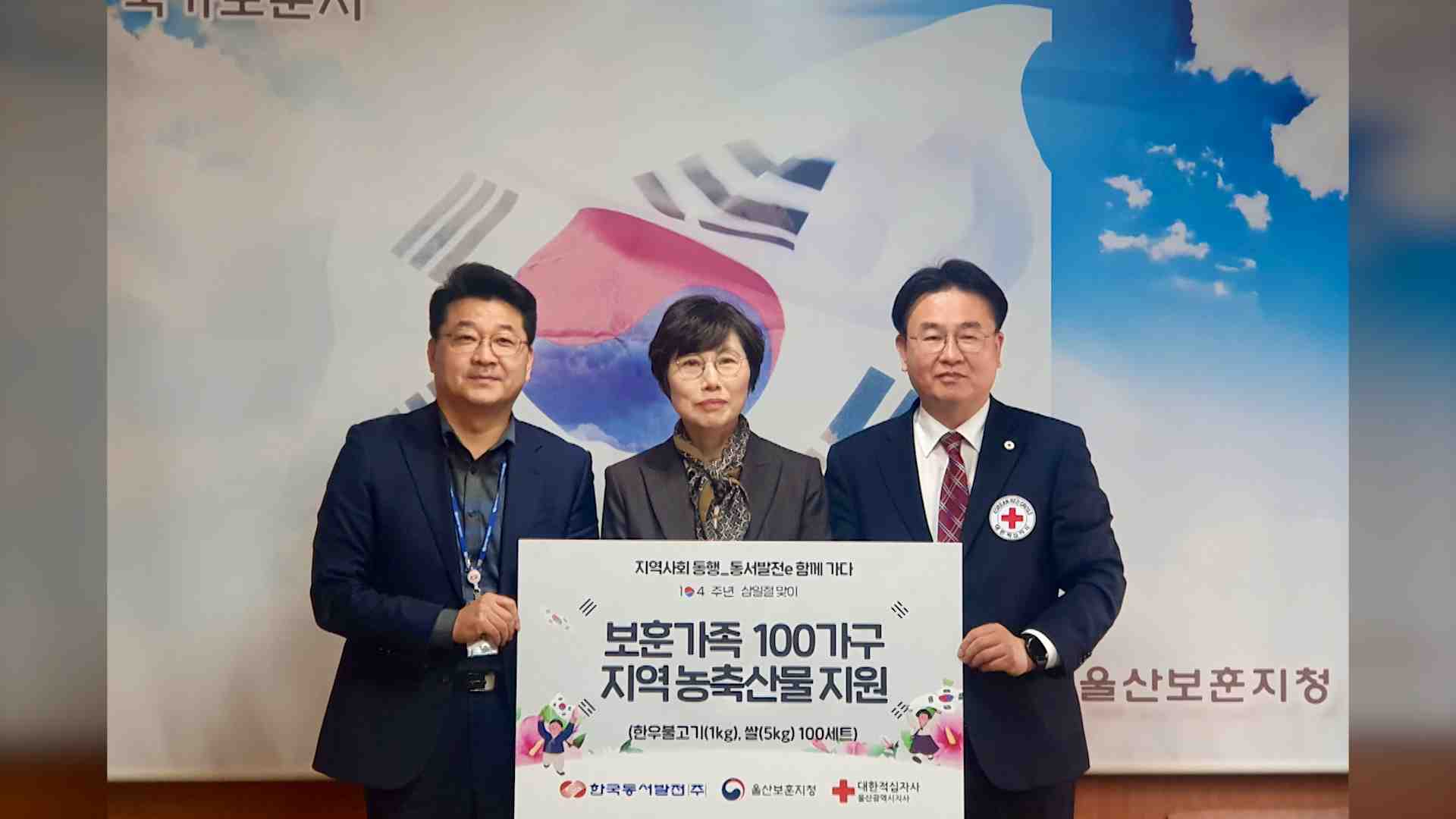 한국동서발전이 3·1절을 맞아 한우 불고기와 지역쌀로 구성된 선물 세트 100개를 울산보훈치정에 전달하며 국가유공자의 헌신에 감사의 뜻을 전했습니다. 울산보훈지청은 다음달 2일부터 국가유공자와 독립유공자, 민주유공자 등 100가구에 이 선물 세트를 전달할 예정입니다.