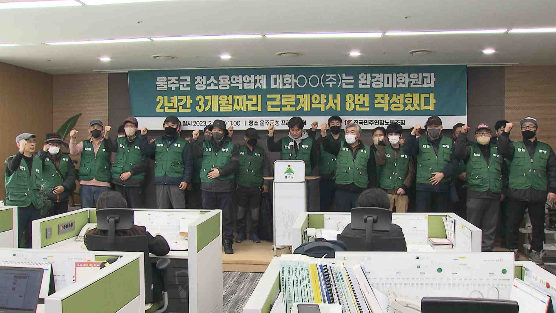 전국민주연합노동조합은 오늘(2/9) 울주군청 프레스센터에서 기자회견을 갖고 울주군의 한 생활폐기물 수집운반업체가 환경미화원 채용시 3개월마다 근로계약서를 갱신하도록 해 근로자들이 고용불안에 시달리고 있다고 주장했습니다. 이들은 이 업체가 직원을 신규 채용할 때 3개월짜리 근로계약서를 8번 쓰고 나서 2년이 ...