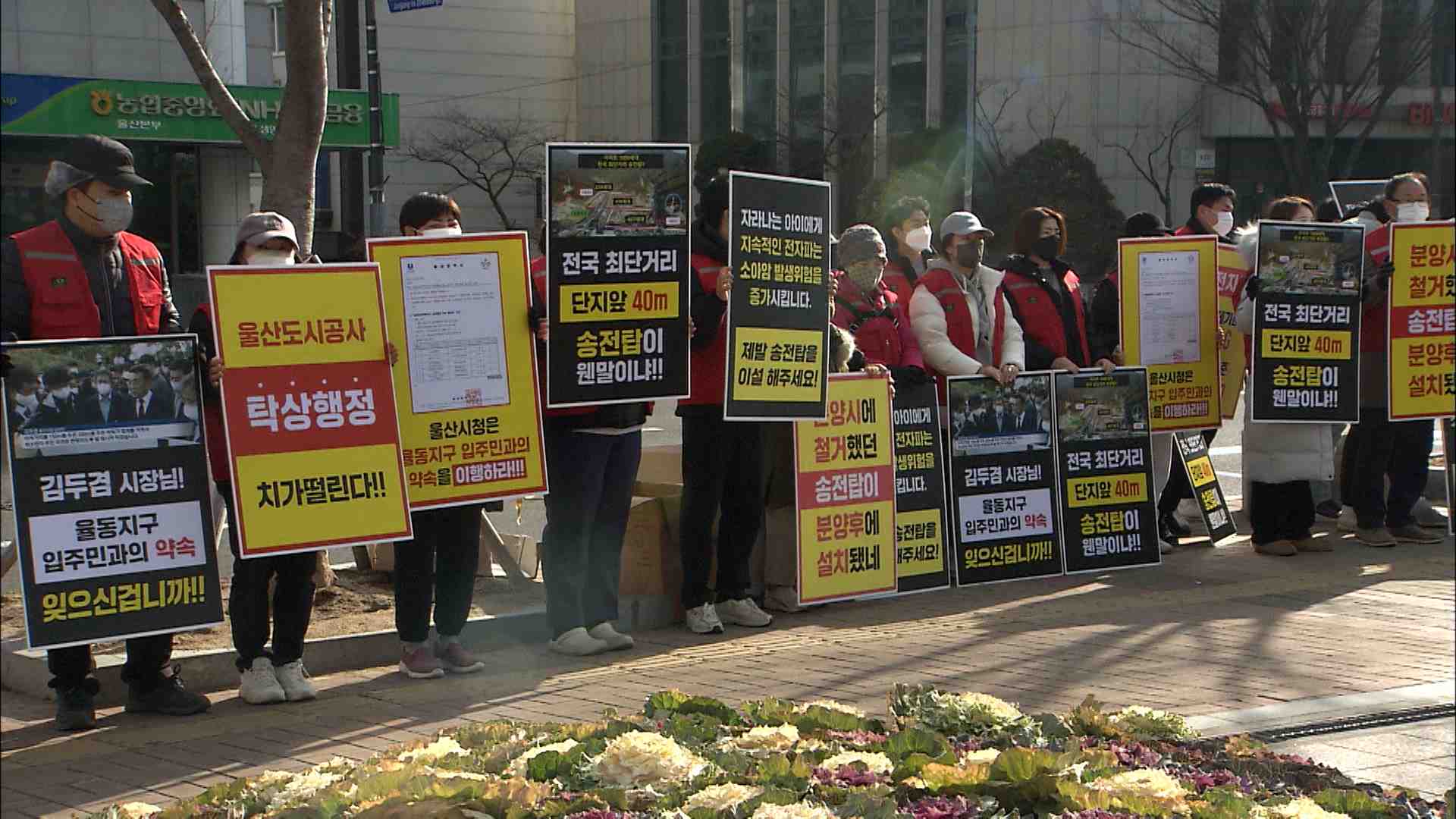 북구 율동 공공주택지구 송전탑 이전 계획이 차질을 빚자 입주 예정 주민들이 오늘(2/1) 기자회견을 열고 조속한 이전을 요구했습니다. 주민들은 문제해결을 하겠다고 나선게 2년이 다되어가지만 바뀐 것 없이 올해 11월 입주를 하게 된 처지라며 울산시가 전면에 나서 달라고 요구했습니다. 송전탑 이전을 추진하던 울산도...