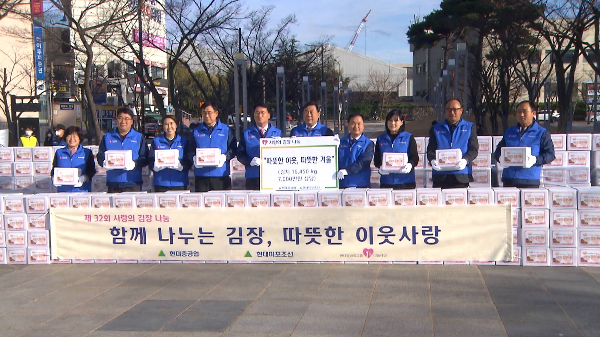 현대중공업과 현대미포조선은 오늘(11/24) 동구 현대백화점 광장에서 '제32회 사랑의 김장 나눔' 행사를 열어, 동구 지역 저소득 가정 2천 세대와 복지시설 44곳에 김장김치를 전달했습니다. 현대중공업은 코로나19와 지속적인 물가 상승으로 올해 김장을 포기하는 가정이 늘어남에 따라 김장 김치를 지난해보다 6천 포기 ...