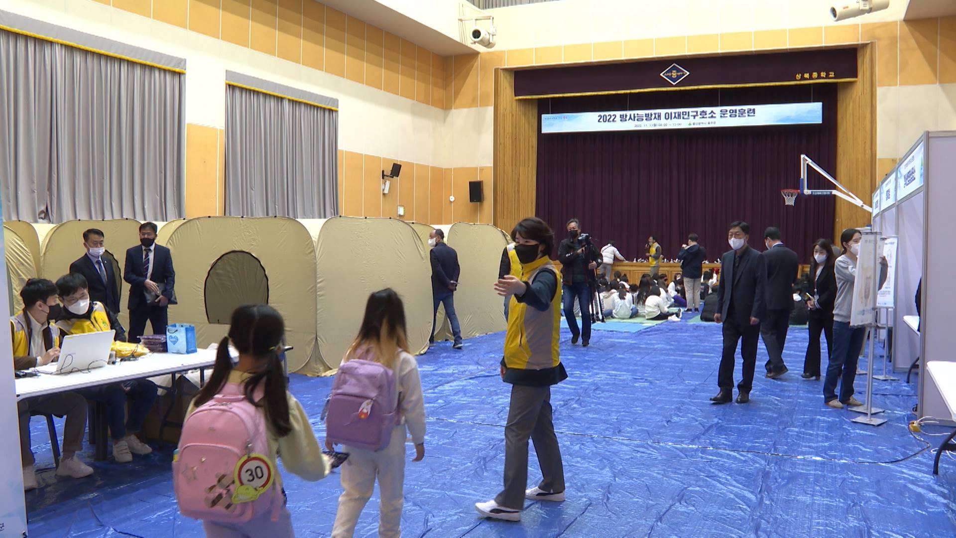 초등학생, 방사능 누출 가상 '실제 구호소'로 대피 훈련