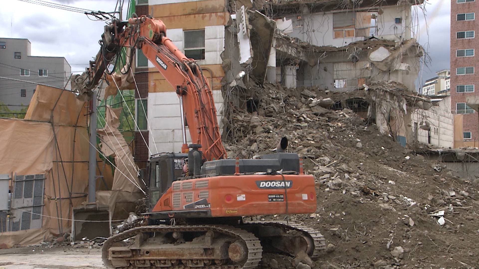 철거 건물 방진벽 기울어져..인명 피해 없어