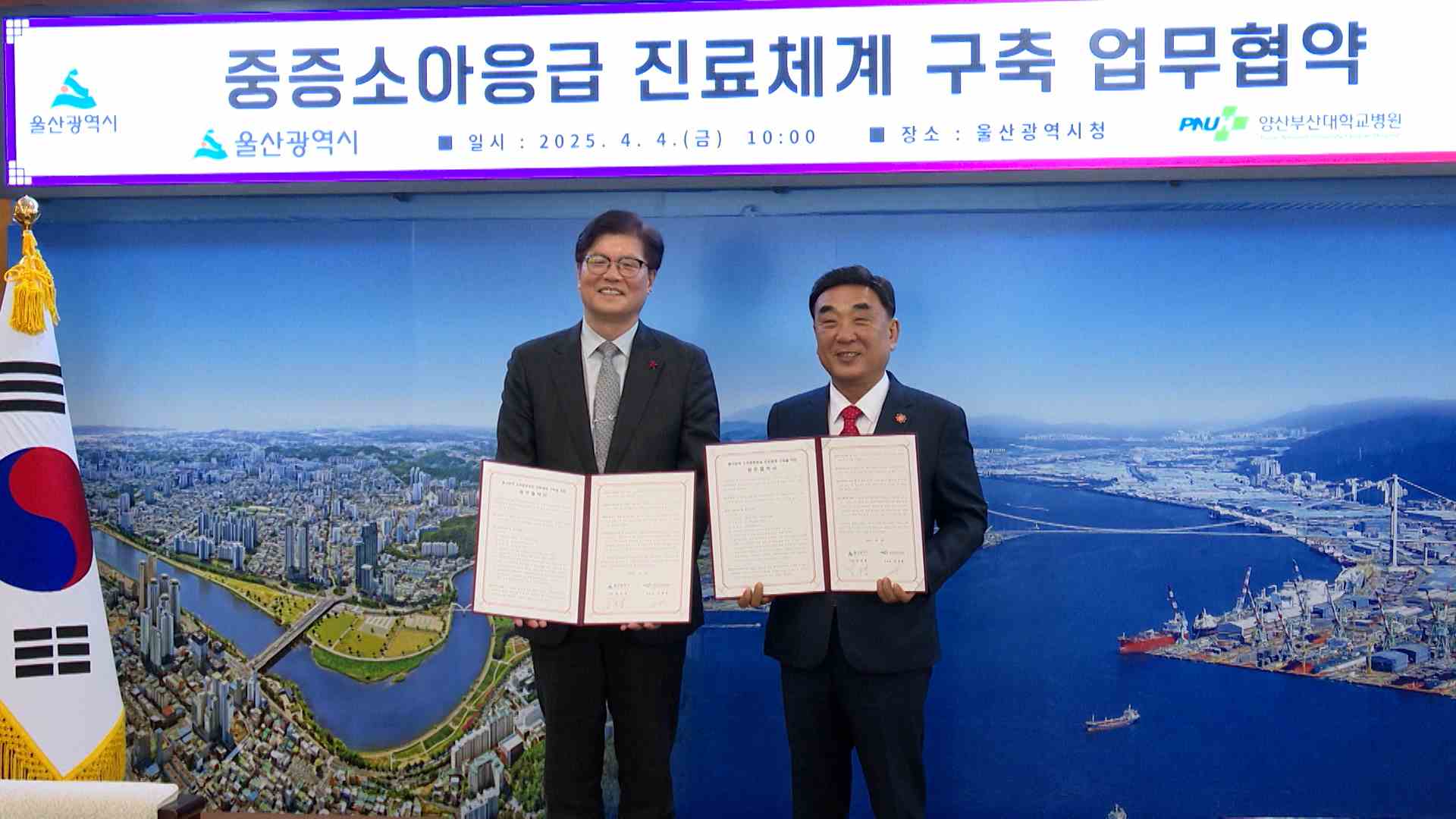 울산시가 지역의 소아중증응급환자 24시간 진료체계 강화를 위해 양산부산대학교 병원과 손을 맞잡았습니다. 울산시는 지난 4일 오후 양산부산대 병원과 협약을 체결하고 울산지역 소아중증환자에 대한 응급 의료 서비스를 제공하기로 했습니다. 양산부산대병원은 울산시의 재정 지원을 통해 울산권역 소아중증환자들이 24...