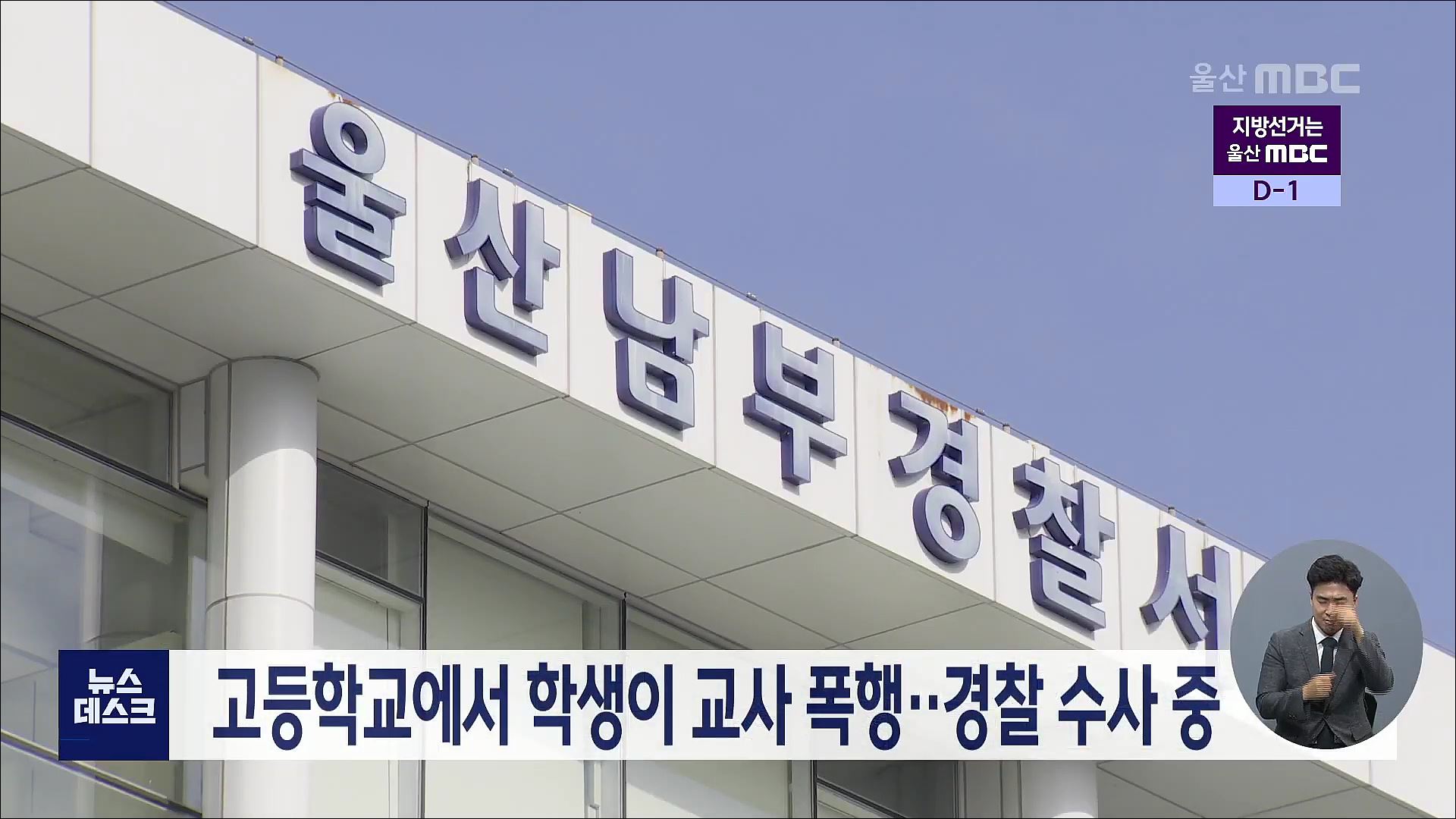 오늘(5/31) 오후 4시 30분쯤 울산의 한 고등학교 1학년 남학생이 교사를 폭행해 경찰이 수사에 나섰습니다. 을신남부경찰서는 학교 안에서 50대 담임선생님을 폭행한 혐의로 1학년 학생 A군을 붙잡아 조사하고 있습니다. 피해 교사는 병원으로 이송돼 치료를 받고 있으며 경찰은 정확한 사건 경위를 조사하고 있습니다.