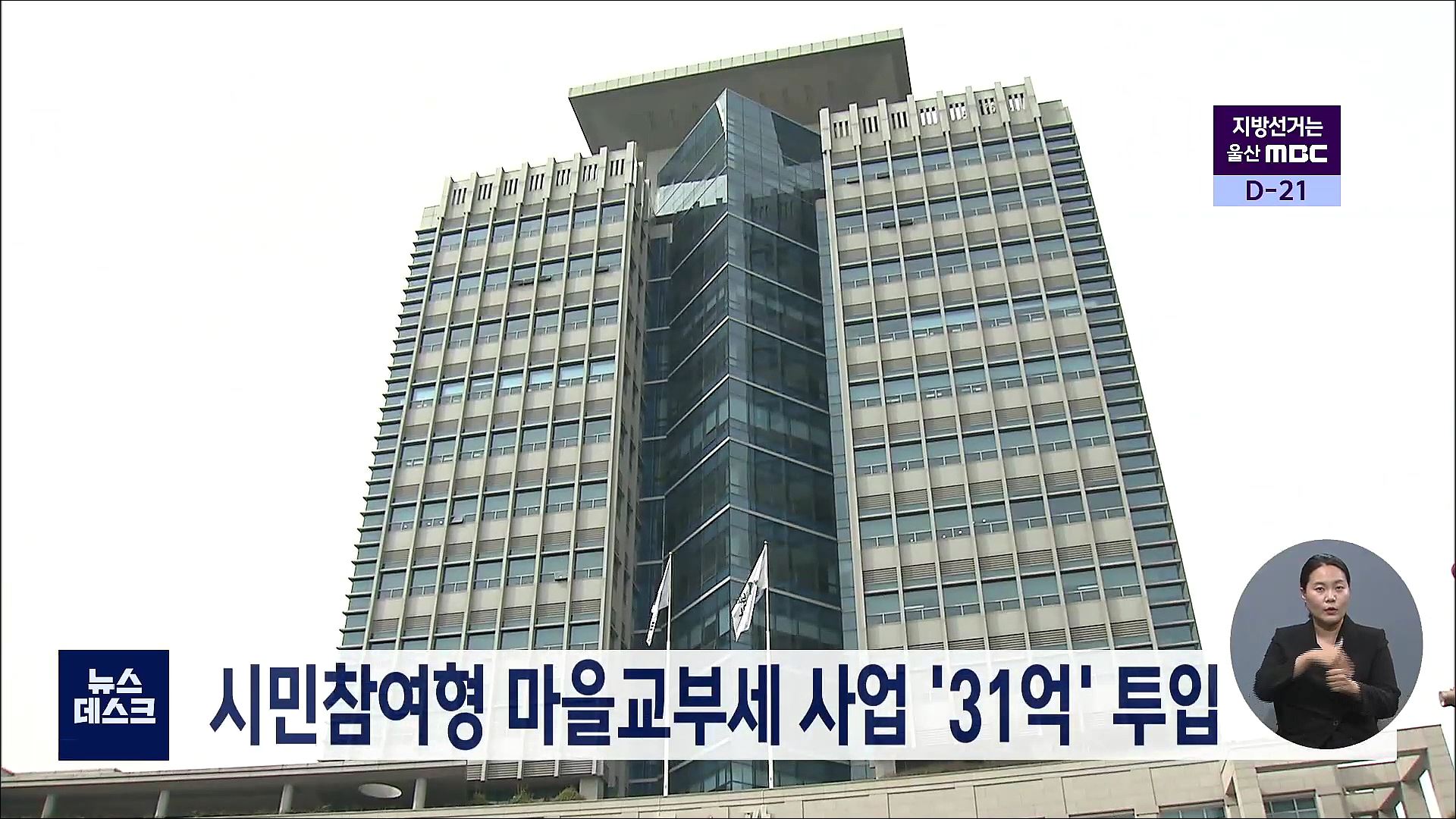 울산시가 올해 시민 참여형 마을 교부세 사업에 31억 원을 투입합니다. 시는 환경 분야 65건, 문화관광 18건, 안전 안심 17건, 주민자치 9건 등 시민이 제안한 121건의 현안 사업을 확정하고 주민세를 나눠주기로 했습니다. 구군별 예산 규모는 남구가 11억 원, 중구 7억7천만 원, 북구 7억 원, 동구 5억2천만 원 등의 순입...