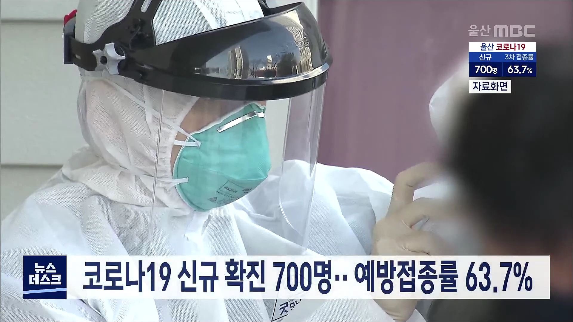 오늘(5/5) 울산에서는 코로나19 신규 확진자가 700명 발생해 누적 확진자는 36만 295명으로 늘었습니다. 한편 요양병원에서 치료를 받던 확진자 2명이 숨져 울산지역 코로나19 누적 사망자는 332명이 됐습니다. 한편, 어제까지 71만 여명이 3차 예방접종을 완료해 접종률 63.7%를 기록했습니다.