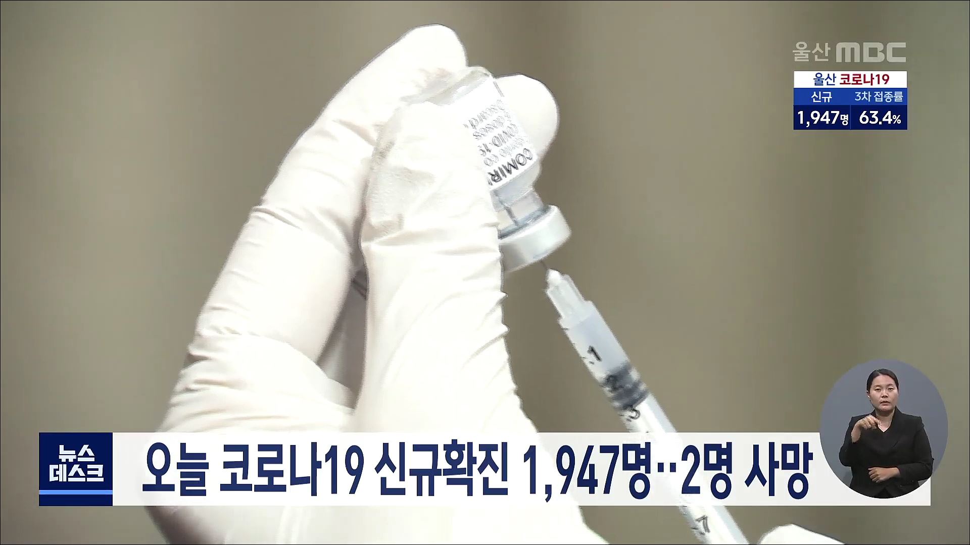 오늘(4/20) 울산에서는 코로나19 신규 확진자가 1천 947명 발생했습니다. 또 80대 확진자 등 2명이 숨져 울산지역의 코로나19 누적 사망자는 317명까지 늘어났습니다. 오늘(4/20) 0시 기준으로 울산에서는 인구의 63.4%가 코로나19 백신 3차 접종을 마쳤습니다.