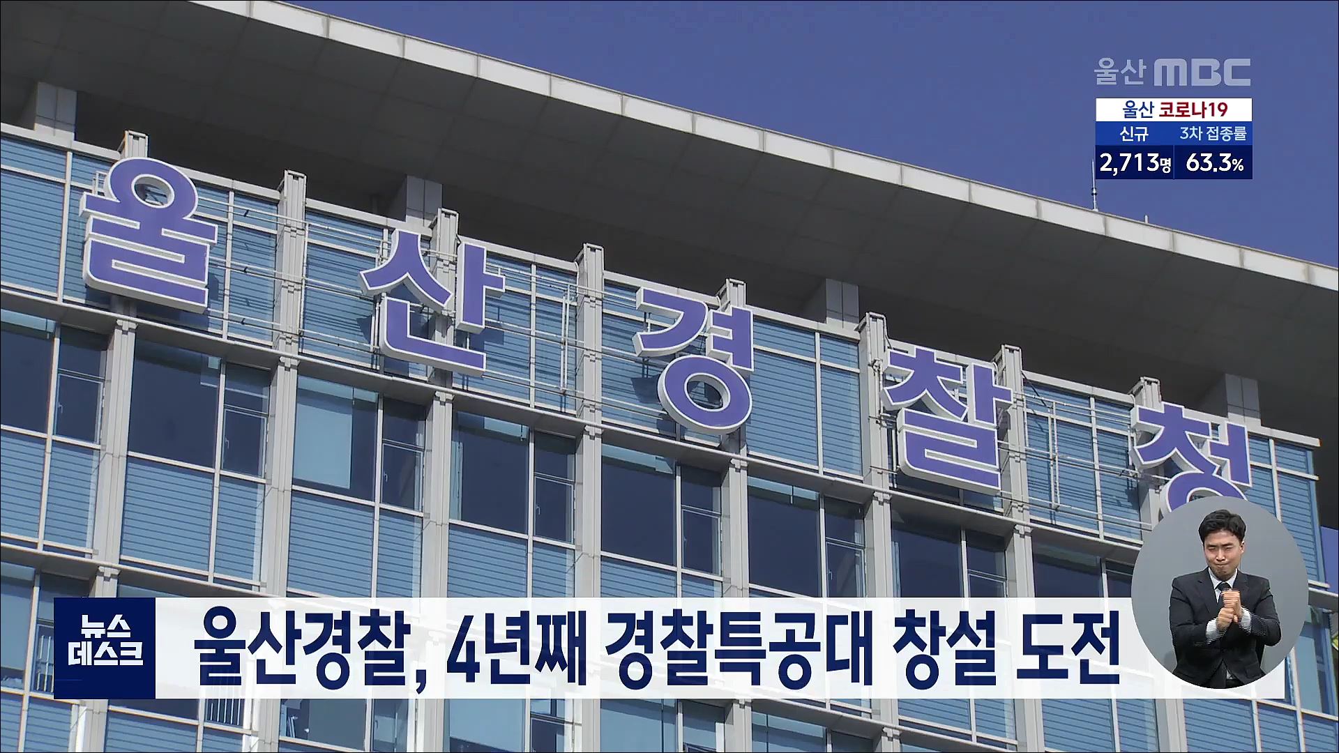 전국 특·광역시 가운데 유일하게 경찰특공대가 없는 울산경찰이 4년째 경찰특공대 창설에 도전합니다. 울산경찰청은 지난 2월 울산을 포함한 강원, 충북 등 3곳의 경찰특공대 창설을 위한 정원안을 경찰청 차원에서 마련해 행정안전부에 제출했다고 밝혔습니다. 경찰은 울산에 전국 최대 규모의 공단이 밀집해 있어 테러 등...