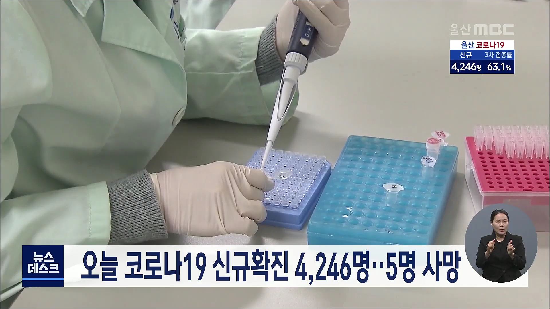 오늘(4/7) 울산에서는 코로나19 신규 확진자가 4천 246명 발생했습니다. 또 기저 질환을 앓던 70대 확진자 등 5명이 숨져, 울산지역의 코로나19 누적 사망자는 277명까지 늘어났습니다. 한편 울산에서는 오늘(4/7) 0시 기준으로 인구의 63.1%가 코로나19 백신 3차 접종을 마쳤습니다.//