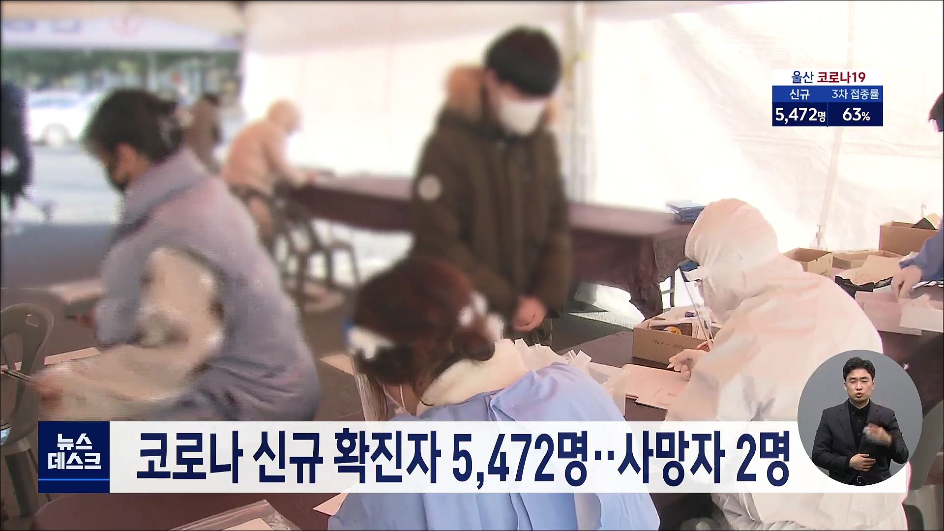 오늘 울산에서는 코로나19 신규 확진자 5천472명이 나왔습니다. 사망자는 요양병원에서 치료를 받던 60대와 80대 환자 2명입니다. 울산의 누적 확진자는 29만1천325명으로 늘었습니다.