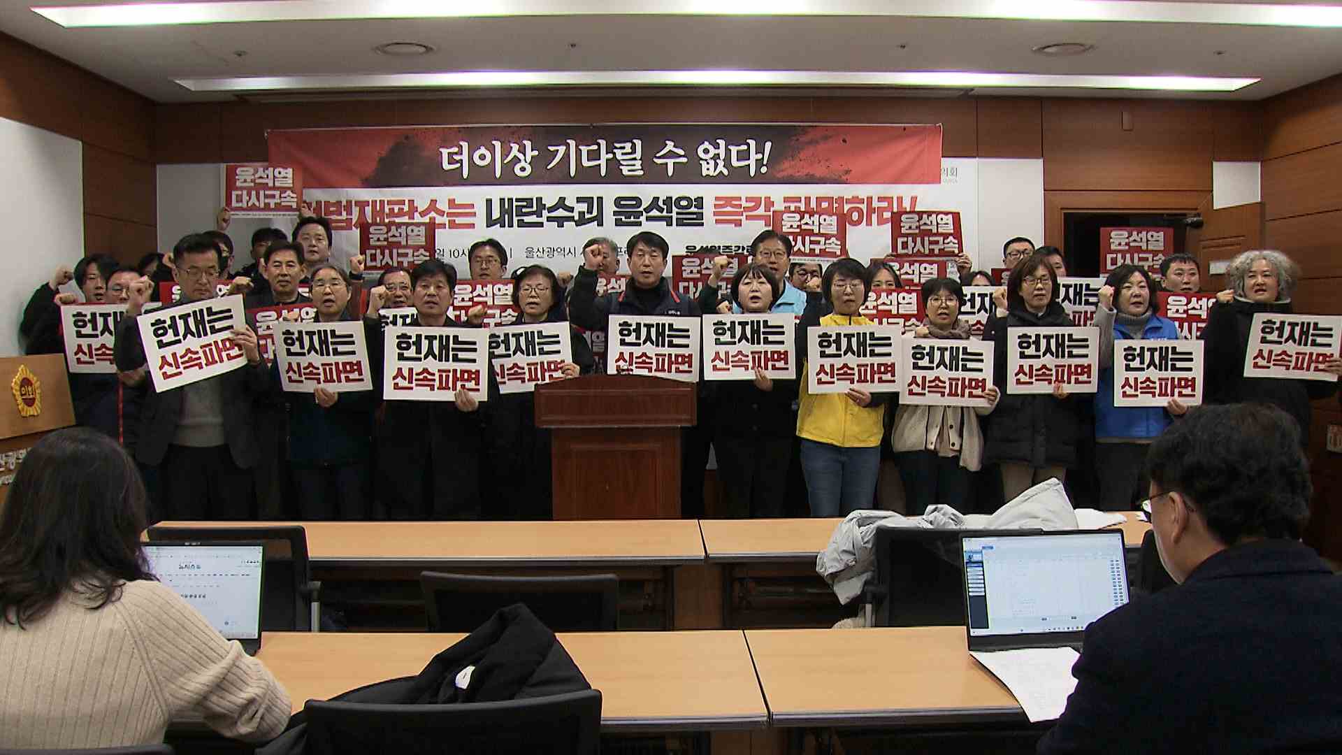 울산지역 시민·사회단체들로 구성된 윤석열 즉각 퇴진 울산운동본부는 오늘(3/18) 기자회견을 갖고 조속한 파면 결정을 촉구했습니다. 이들은 시민들의 일상과 경제, 내치와 외교 등 우리 사회 전반의 불확실성이 높아지고 있다며 이번 주 중에 헌법재판소의 파면 선고가 이뤄져야 한다고 요구했습니다. 또 조속한 파면 선...