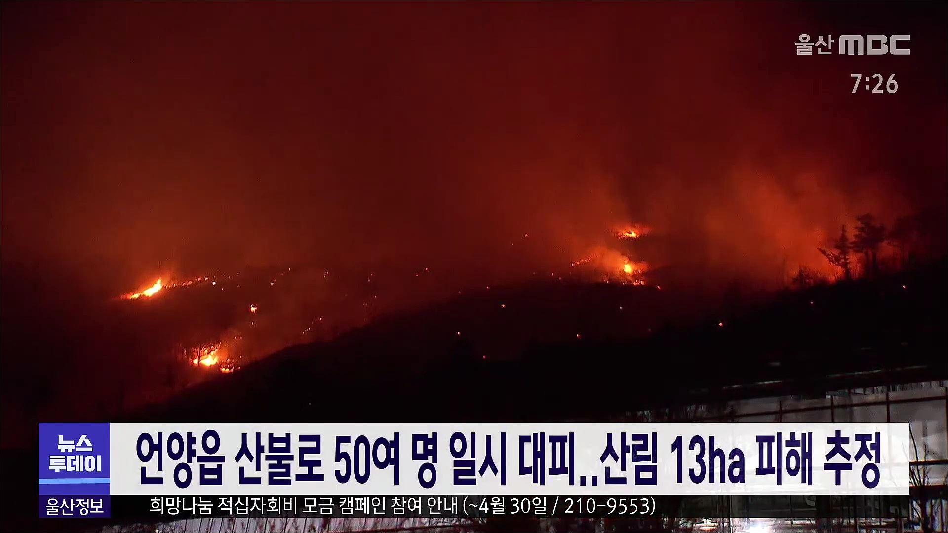 울주군 산불로 50여명 일시 대피..13ha 피해 추정