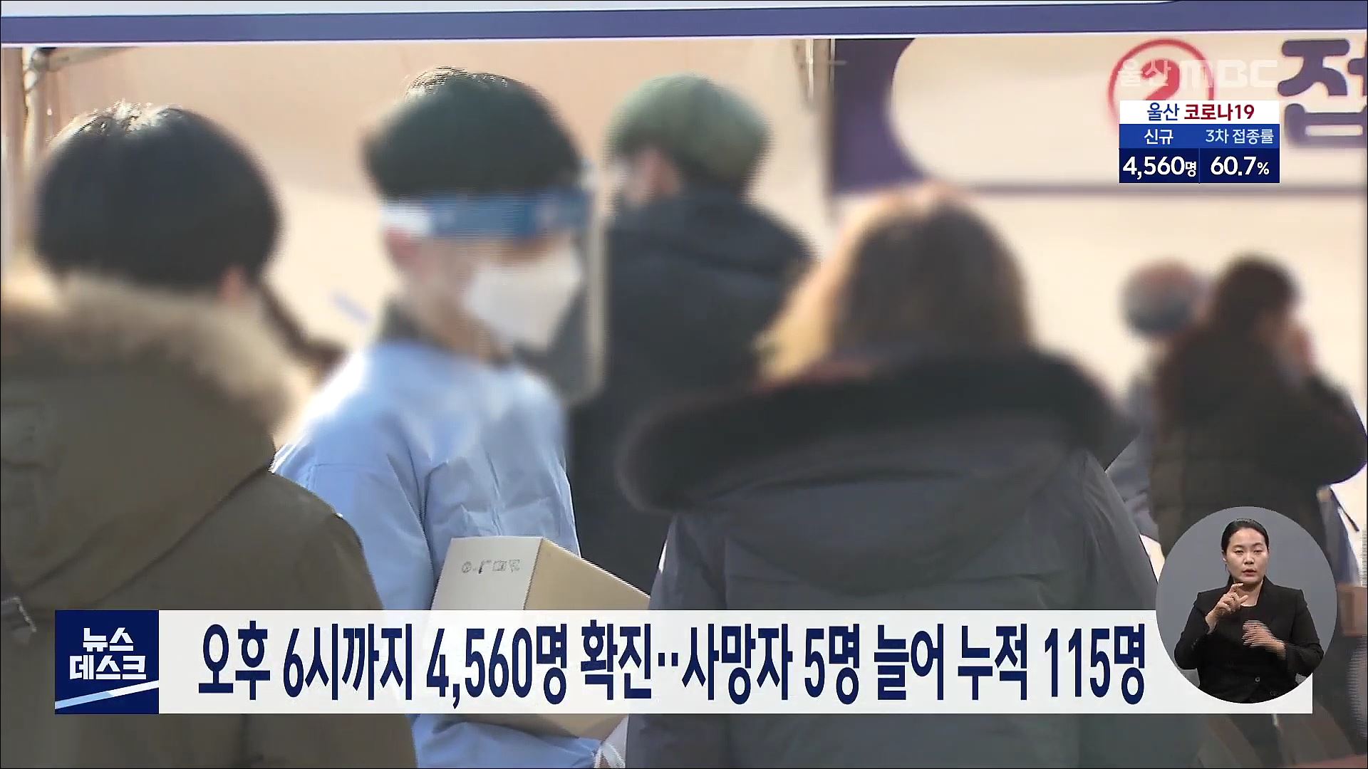 오늘(3/7) 0시부터 오후 6시까지 울산에서는 4천560명의 신규 코로나19 확진자가 발생했습니다. 이로써 울산 지역 코로나19 누적 확진자는 8만5천954명으로 늘었으며, 확진자 중 5명이 숨져 누적 사망자는 115명으로 늘었습니다. 추가 사망자 5명 모두 80∼90대로 기저질환이 있었던 것으로 확인됐습니다.//