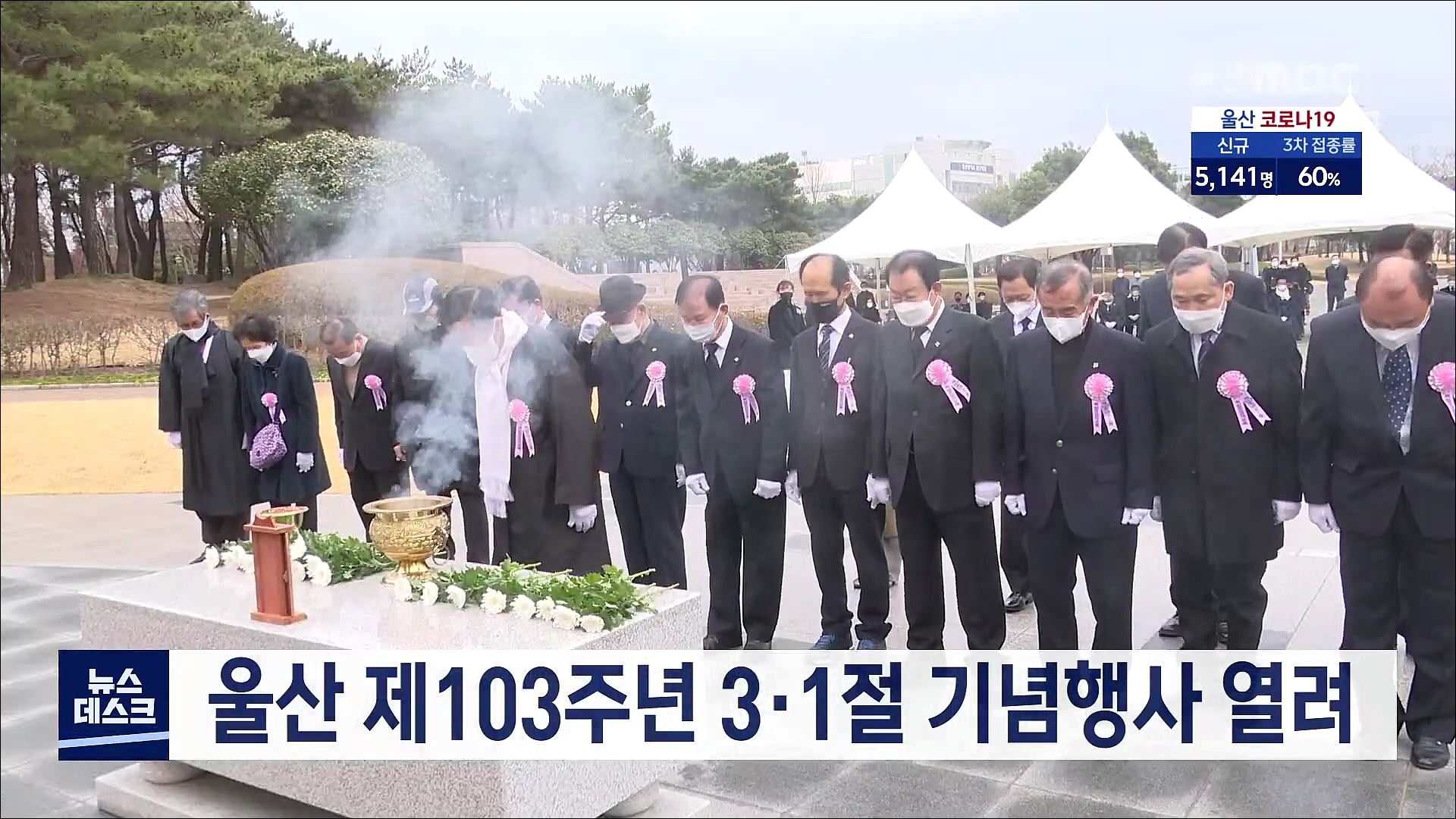 103주년 3.1절을 맞아 울산에서도 오늘(3/1) 기념행사가 열렸습니다. 송철호 울산시장을 비롯해 보훈단체 관계자 등 40여 명은 울산 항일독립운동 기념탑을 참배한 뒤, 문화예술회관 대공연장에서 독립유공자와 유가족 등을 초청해 독립선언문 낭독, 만세삼창 등 기념행사를 진행했습니다.송철호 / 울산시장"언양과 병영, ...
