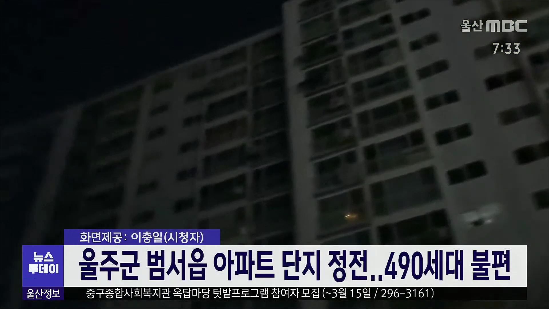 어제(3/1) 저녁 9시 18분쯤 울산 울주군 범서읍의 한 아파트 단지에 정전이 발생해 490여 세대가 밤사이 불편을 겪었습니다. 정전으로 인한 엘리베이터 고립 등 인명피해는 없는 것으로 확인됐습니다. 한전은 전기 선로에는 이상이 없으며, 아파트 단지 내 변압기가 파손되어 정전이 발생했다고 설명했습니다.