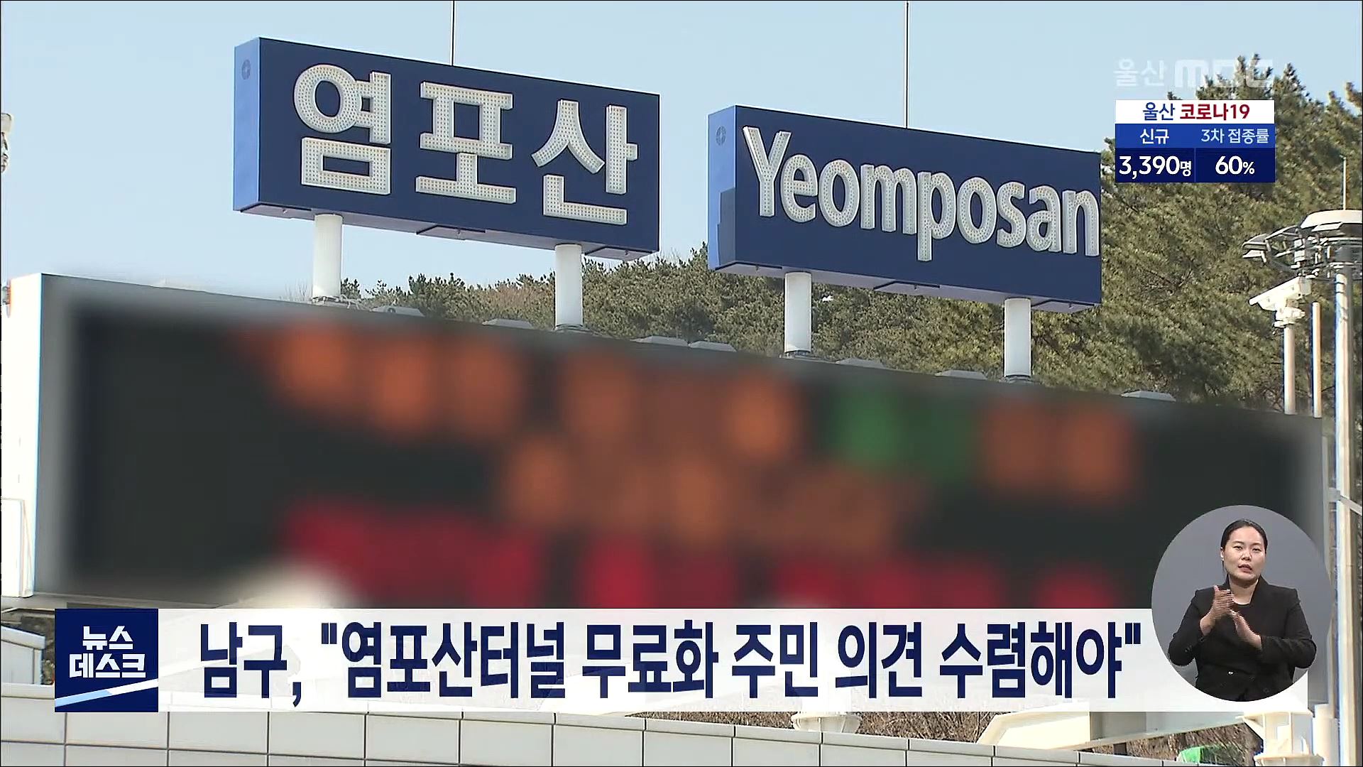 울산시가 염포산 터널 무료화를 추진하는 가운데 남구가 주민 의견을 수렴할 필요가 있다는 입장을 밝혔습니다. 남구는 염포산터널 이용차량 전체 가운데 약 26%는 타지역 차량이라며, 타지역 차량까지 지원하는 것에 주민들이 동의하는지 의견을 수렴해야 한다고 주장했습니다.