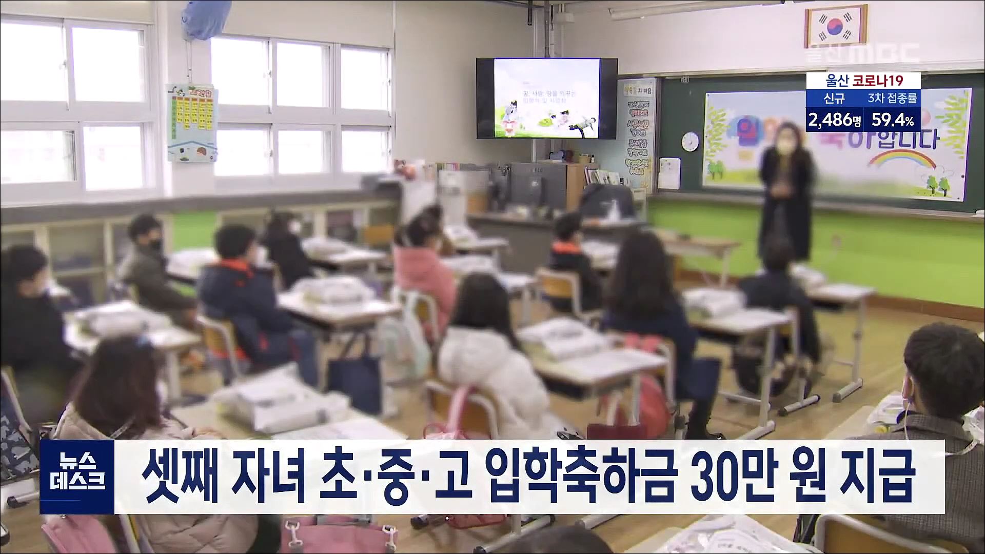 울주군은 다음 달부터 초·중·고등학교에 입학하는 셋째 이상 자녀에게 입학축하금 30만원을 지원합니다. 지원 대상은 입학일을 기준으로 부모와 함께 6개월 이상 울주군에 주민등록을 두고 있는 셋째 이상 초·중·고 입학생입니다.