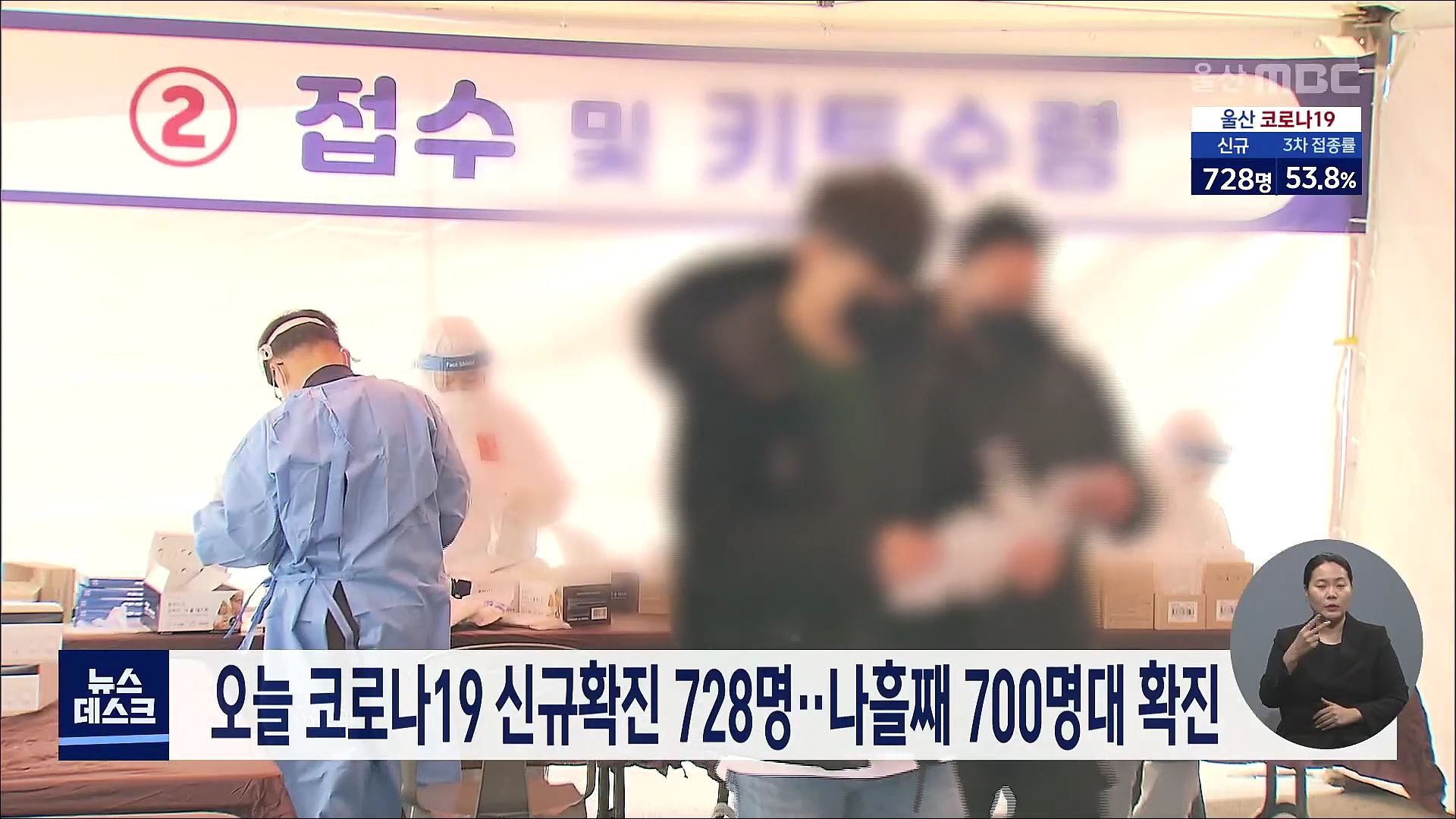 오늘(2/11) 울산에서는 코로나19 신규 확진자가 728명 발생해 나흘째 하루 확진자 700명대를 기록하고 있습니다. 이들 중 210명은 기존 확진자를 접촉했던 것으로 파악됐고, 나머지 518명은 감염 경로를 조사중입니다.