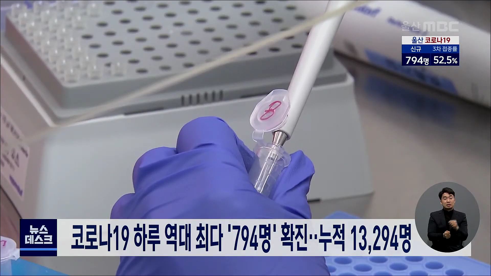 오늘(2/7) 울산에서는 코로나19 확진자 역대 최다인 794명이 추가로 발생했습니다. 이들 중 215명은 기존 확진자와 접촉해 감염됐으며 , 3명은 해외입국자, 576명은 감염 경로를 파악하고 있습니다. 울산의 현재 누적 확진자는 1만3천294명으로 늘었습니다.