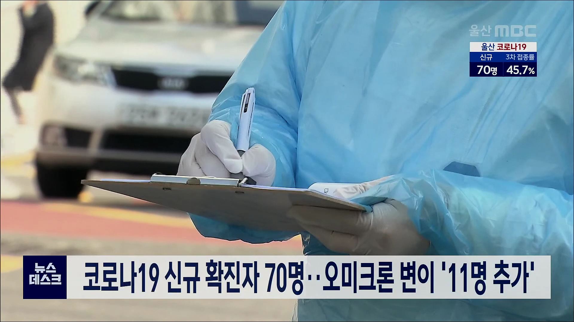 오늘(1/23) 울산에서는 현재까지 코로나19 신규 확진자가 70명 발생해 누적 확진자는 7천859명으로 늘었습니다. 이 중 54명은 기존 확진자의 접촉자이며, 3명은 우즈베키스탄과 미국 등을 다녀온 해외입국자, 나머지 13명은 감염 경로가 아직 확인되지 않았습니다. 한편 오미크론 변이 감염자는 11명이 추가돼 지금까지 178...