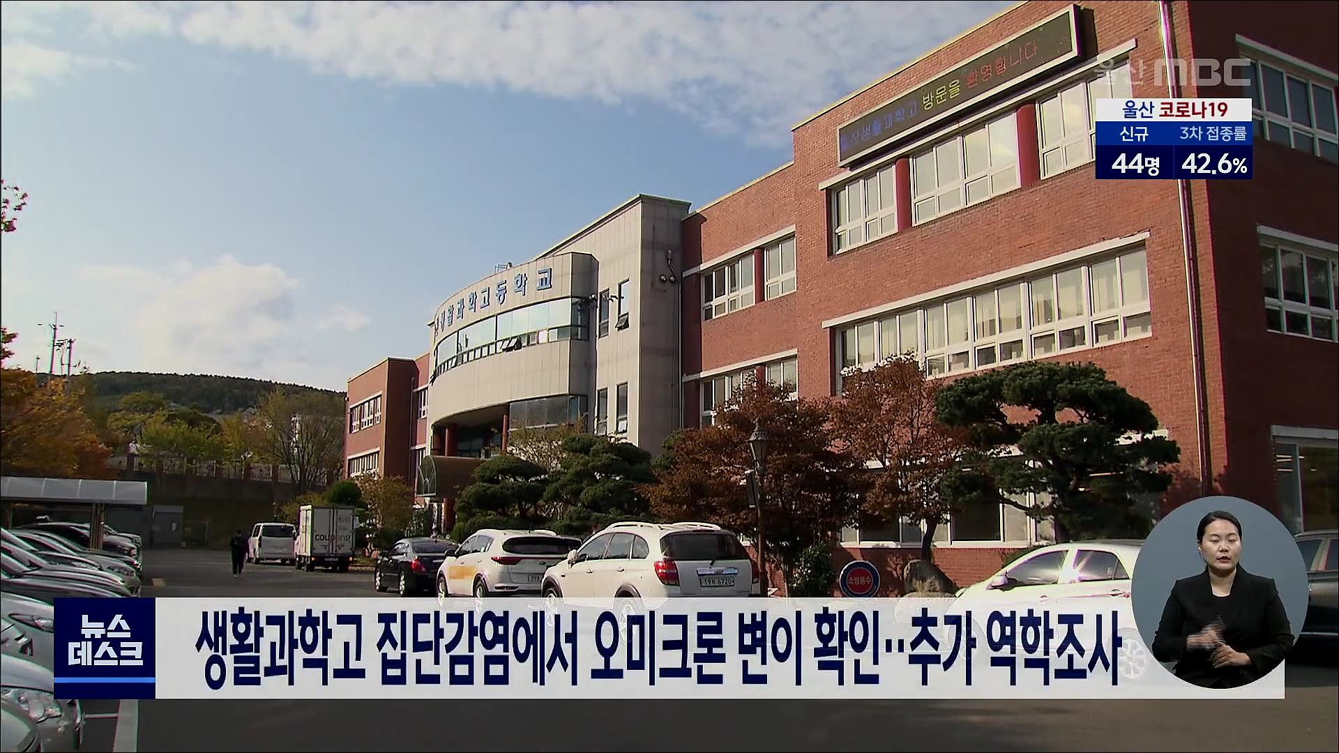 오늘(1/18) 울산에서는 현재까지 코로나19 신규 확진자가 44명 발생했습니다. 이들 중 3명은 울산생활과학고 유도부 집단감염 관련 확진자로 이 감염의 누적 확진자는 24명까지 늘었습니다. 한편 이 집단감염 확진자 중 5명이 오미크론 변이에 감염된 것으로 확인돼 방역 당국은 기존 확진자들과 접촉자들에 대해 변이 바이...