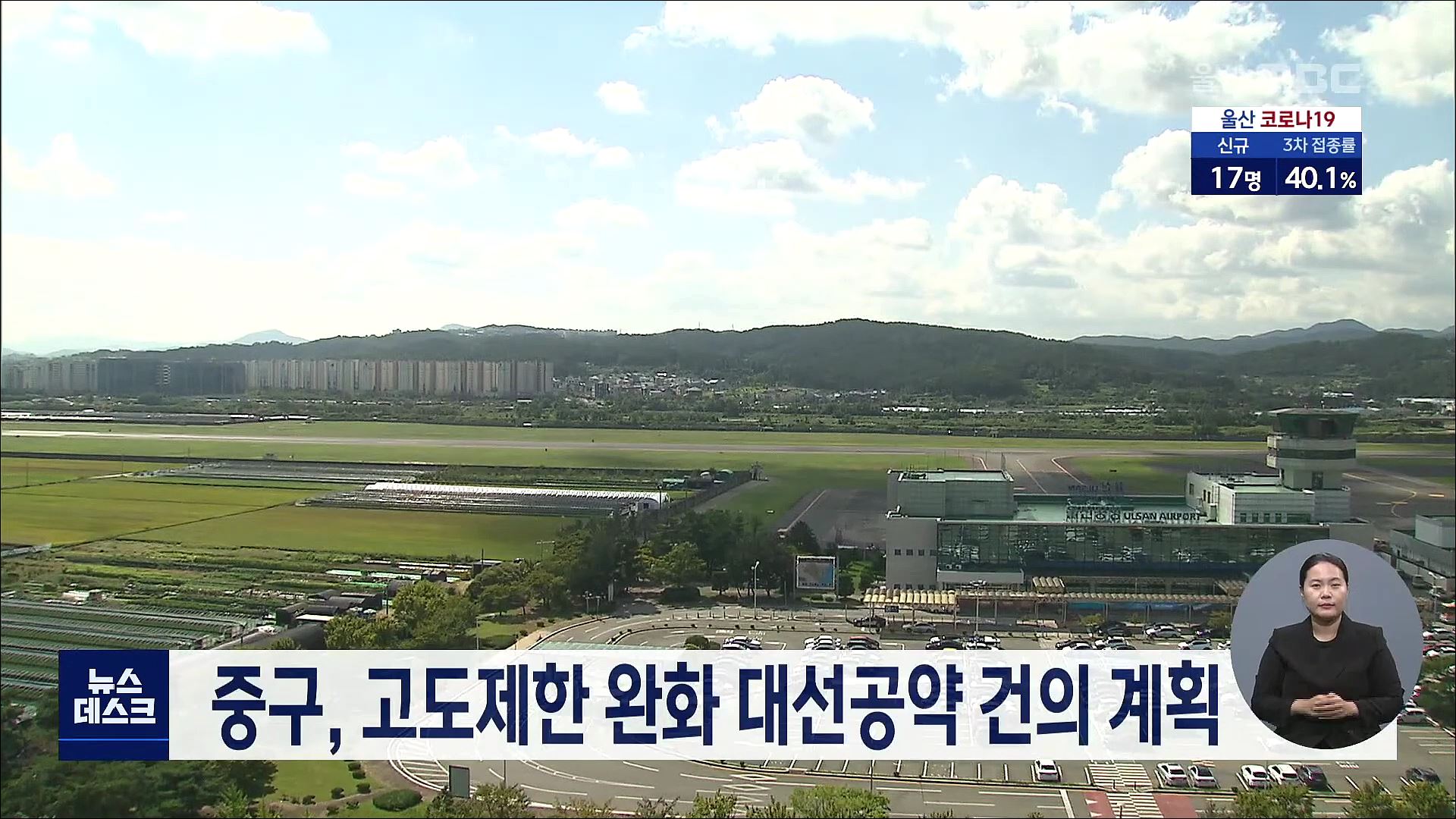 중구가 울산공항 고도제한 완화를 대선공약으로 건의하기로 했습니다. 중구는 이달 말 민주당과 국민의힘에 울산공항 주변 고도제한 완화에 대한 건의서를 전달할 계획입니다. 울산지역 고도제한은 공항을 중심으로 반경 3.8km를 기준으로 하고 있습니다.