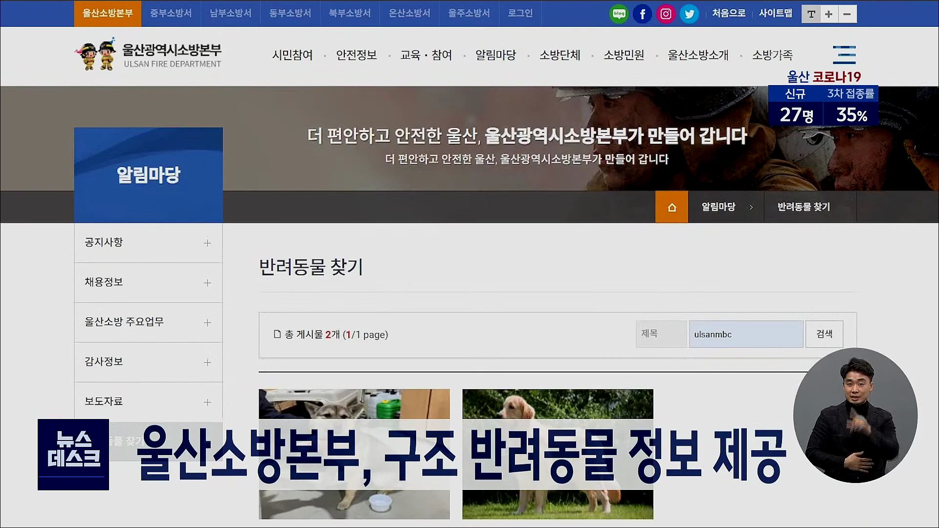 울산소방본부는 누리집을 통해 119에 구조된 반려동물에 대한 정보를 제공합니다. '119에 구조된 반려동물 찾기'는 현장에서 구조된 반려동물의 포획부터 보호, 유관기관 인계까지 단계별 정보를 제공합니다. 지난해 119 생활안전 구조활동 1만 2천여 건 중 동물 포획 활동은 1천 400여 건으로 11.3%를 차지했습니다.