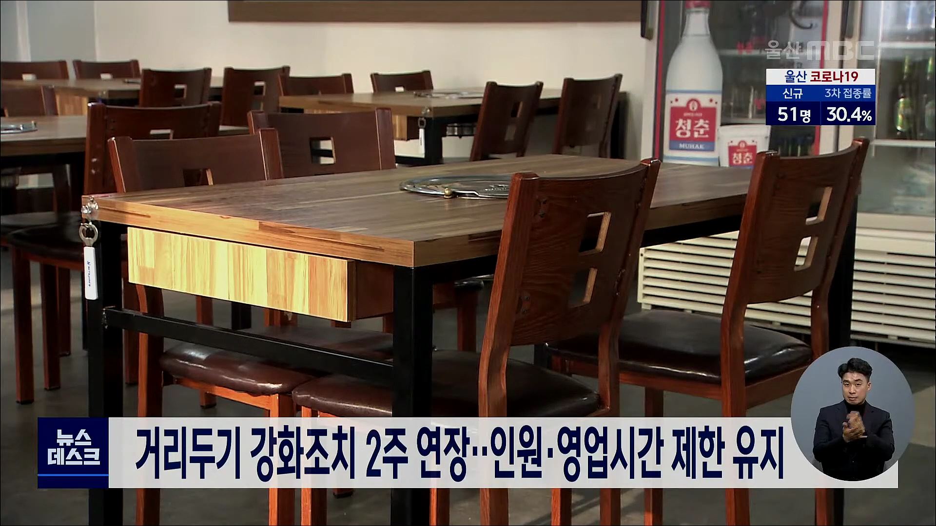 정부의 거리두기 강화조치 2주 연장에 발맞춰 울산시도 지금의 거리두기 방역수칙을 내년 1월 16일까지 2주간 연장합니다. 이번 조치에 따라 기존 음식점과 카페 등 다중이용시설의 4인 인원제한과 영업시간 9시는 그대로 유지됩니다. 영화관과 공연장의 운영시간이 기존 오후 10시에서 오후 9시로 앞당겨지고, 내년 1월 10...