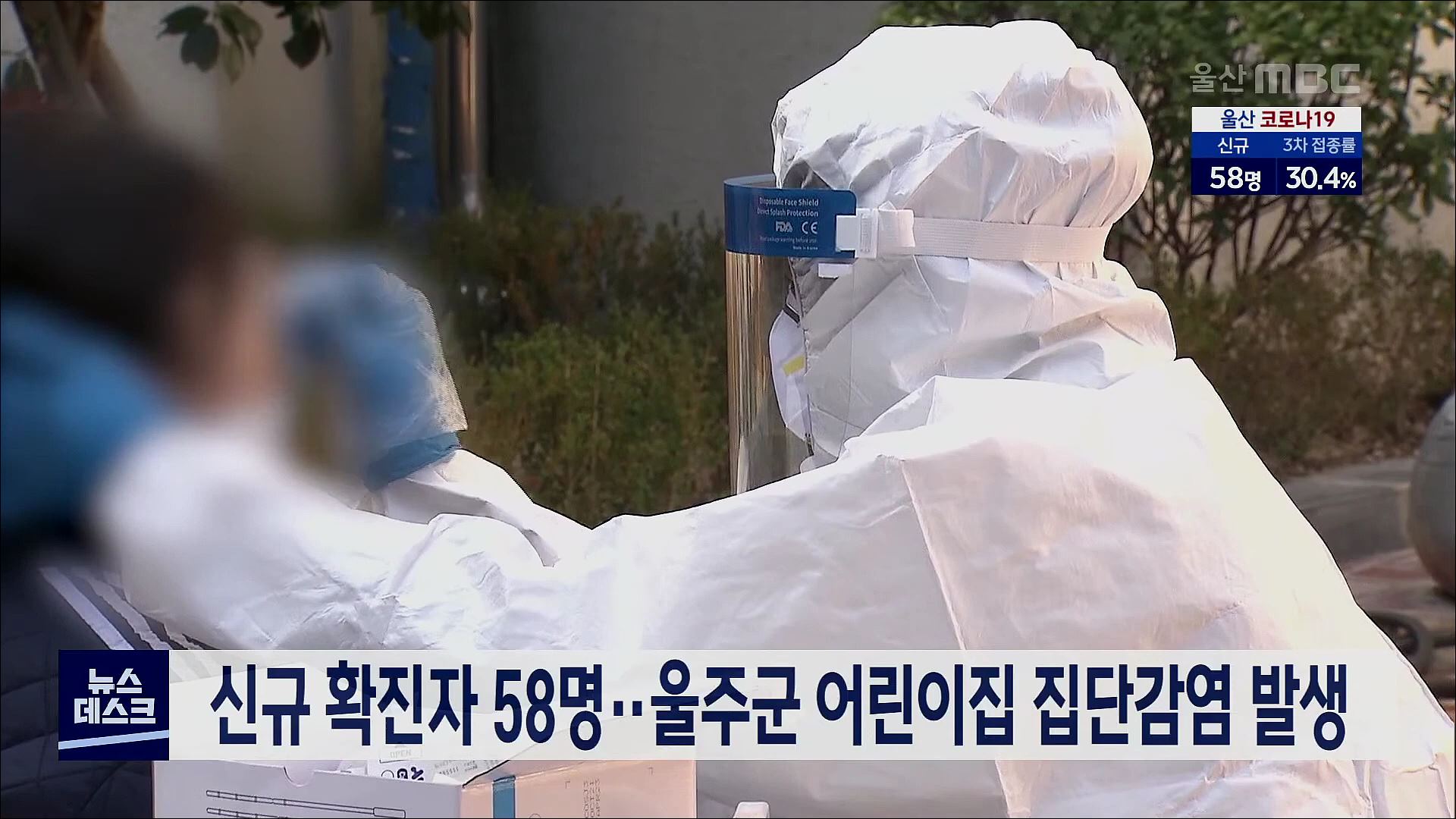 울산에서는 오늘(1/1) 코로나19 신규 확진자 58명이 발생했습니다. 집단감염이 발생한 동구 어린이집과 북구 초등학교 관련 확진이 계속되고 있으며, 울주군의 한 어린이집에서도 지금까지 관련확진자 14명이 발생하며 새로운 집단감염이 확인됐습니다. 또 지난달 25일 영국에서 입국한 오미크론 감염자의 가족 한명이 오미...
