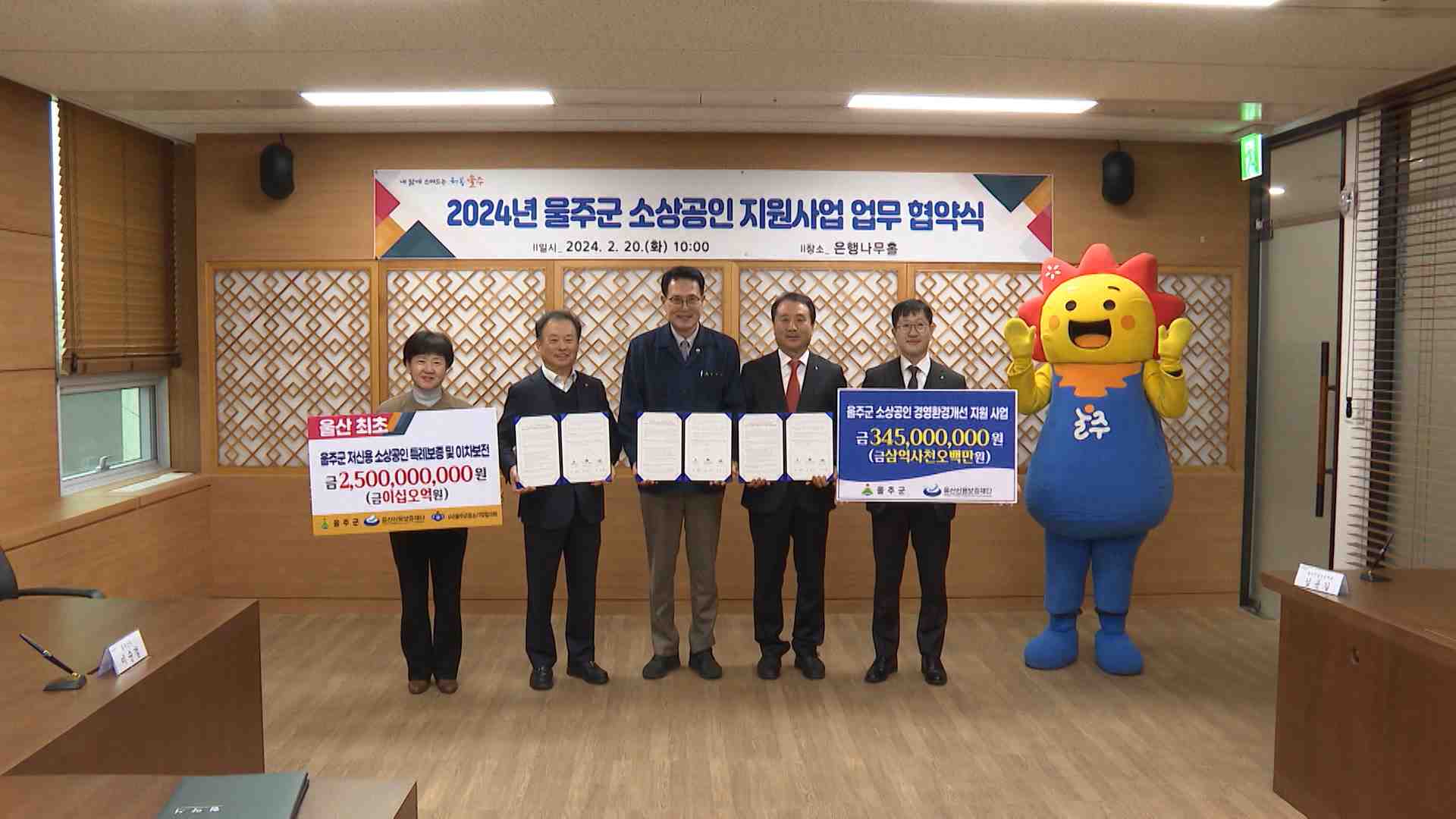울주군은 오늘(2/20) 울산신용보증재단, 울주군 중소기업협의회와 공동으로 소상공인 지원사업 업무협약을 체결했습니다.협약에 따라 참여기관들은 저신용 소상공인 특례보증과 경영환경개선사업 등 2개 사업에 협력하며, 노후화된 점포 환경개선비로 소상공인 1인당 최대 200만원을 지원하기로 했습니다.