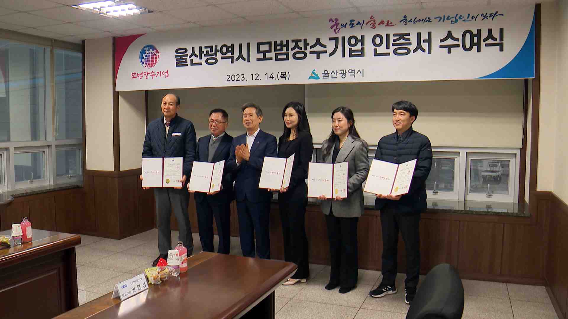 울산시는 '2023년 울산시 모범장수기업'으로 선정된 5개 회사에 인증서를 수여했습니다.5개 기업은 특수볼트제조업체인 노벨정밀금속을 비롯해 태원, 국일인토트, 케이디밸브, 삼미기계입니다.모범장수기업은 30년 이상된 중소기업 중 상시 고용 인원 10명 이상인 곳을 대상으로 지역경제 기여도, 혁신성, 핵심역량 등을 평...