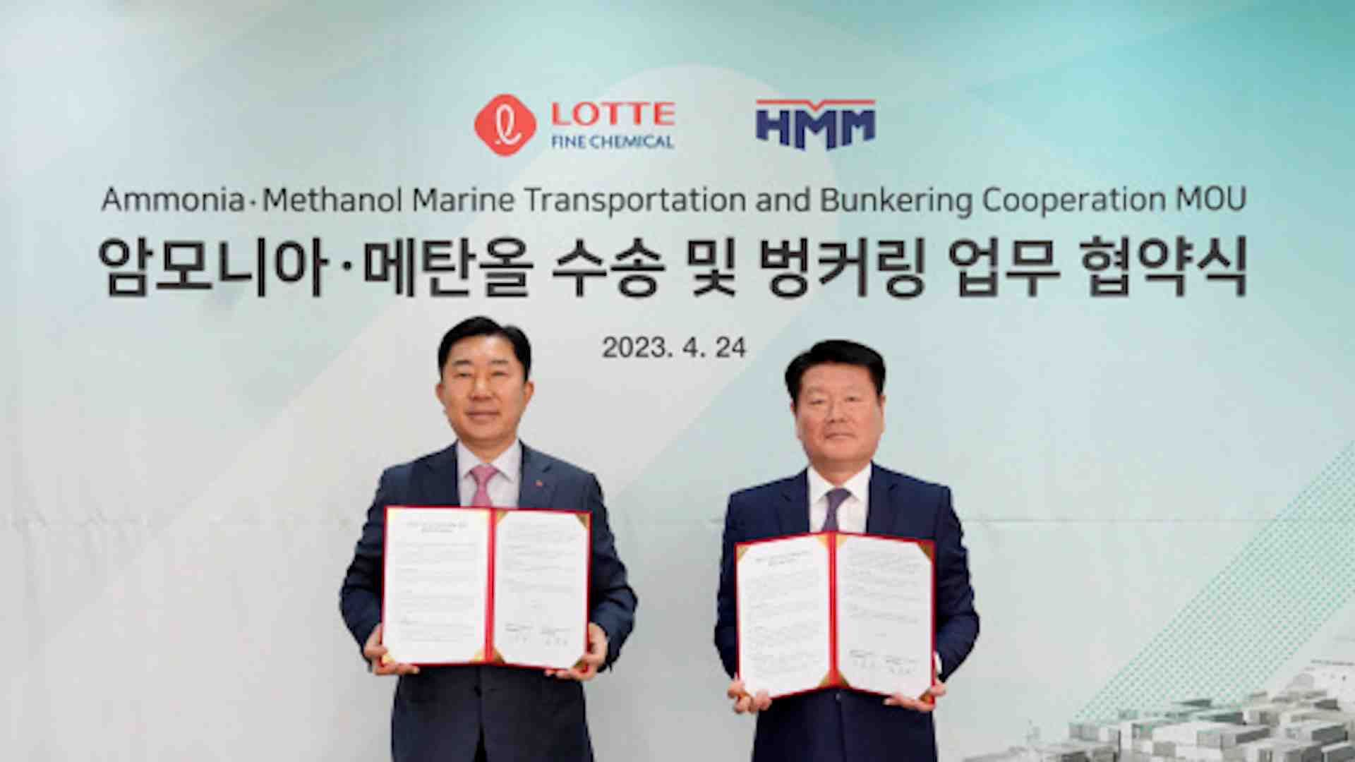 HMM과 롯데정밀화학이 차세대 친환경 연료로 주목받고 있는 암모니아의 해상 운송·공급을 위해 업무협약을 체결했습니다. 두 업체는 이번 협약으로 사업 협력 분야를 암모니아 해상운송과 메탄올 벙커링으로 확대하고 HMM은 롯데정밀화학이 해외에서 확보한 암모니아의 해상운송을 담당합니다. 국제에너지기구 보고서에 따...