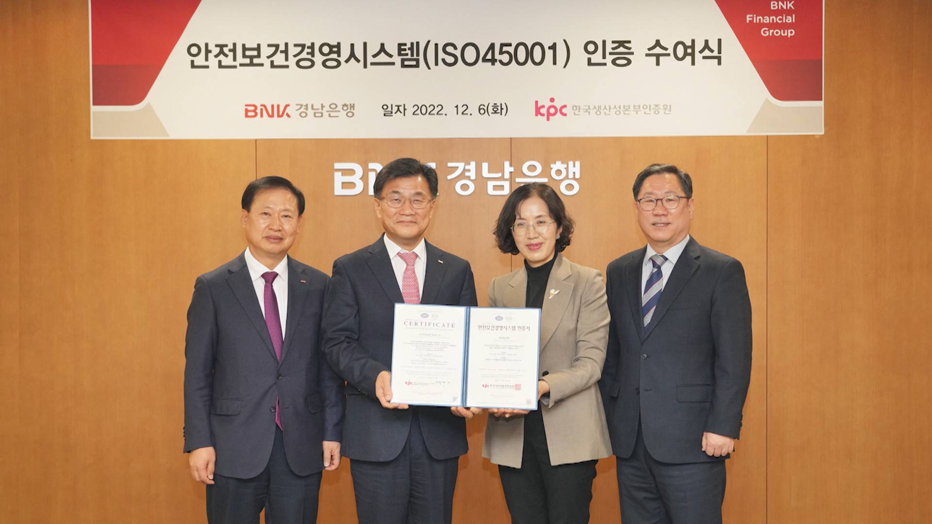 BNK경남은행이 지방은행 최초로 '안전보건경영시스템 인증'을 획득했습니다. 안전보건경영시스템은 국제표준기구 ISO가 2018년 제정한 안전보건에 관한 최고 수준의 국제인증입니다. 경남은행은 안전보건 추진계획 수립과 교육, 실행, 평가 등 체계적인 관련 시스템 구축이 높게 평가를 받았다고 밝혔습니다.
