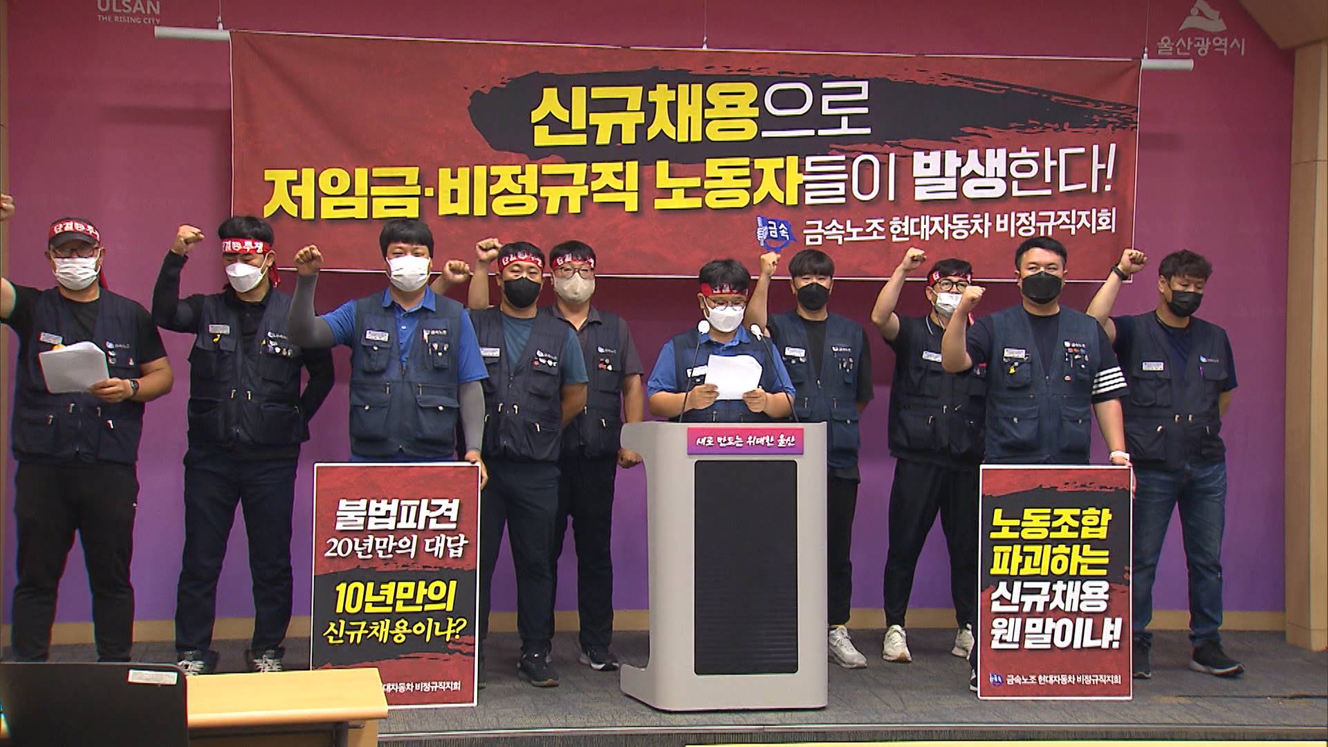 현대차 비정규직노조는 오늘(7/13)울산시청 프레스센터에서 기자회견을 열고 "불법파견 비정규직 문제를 해결하지 않는 현대차는 신규채용을 당장 중단하라"고 촉구했습니다. 이들은 "수천명이 넘는 불법파견 비정규직 노동자들이 정규직 전환을 위해 법정다툼을 벌이고 있는데, 현대차가 전기차 공장 신설과 신규 채용을 ...