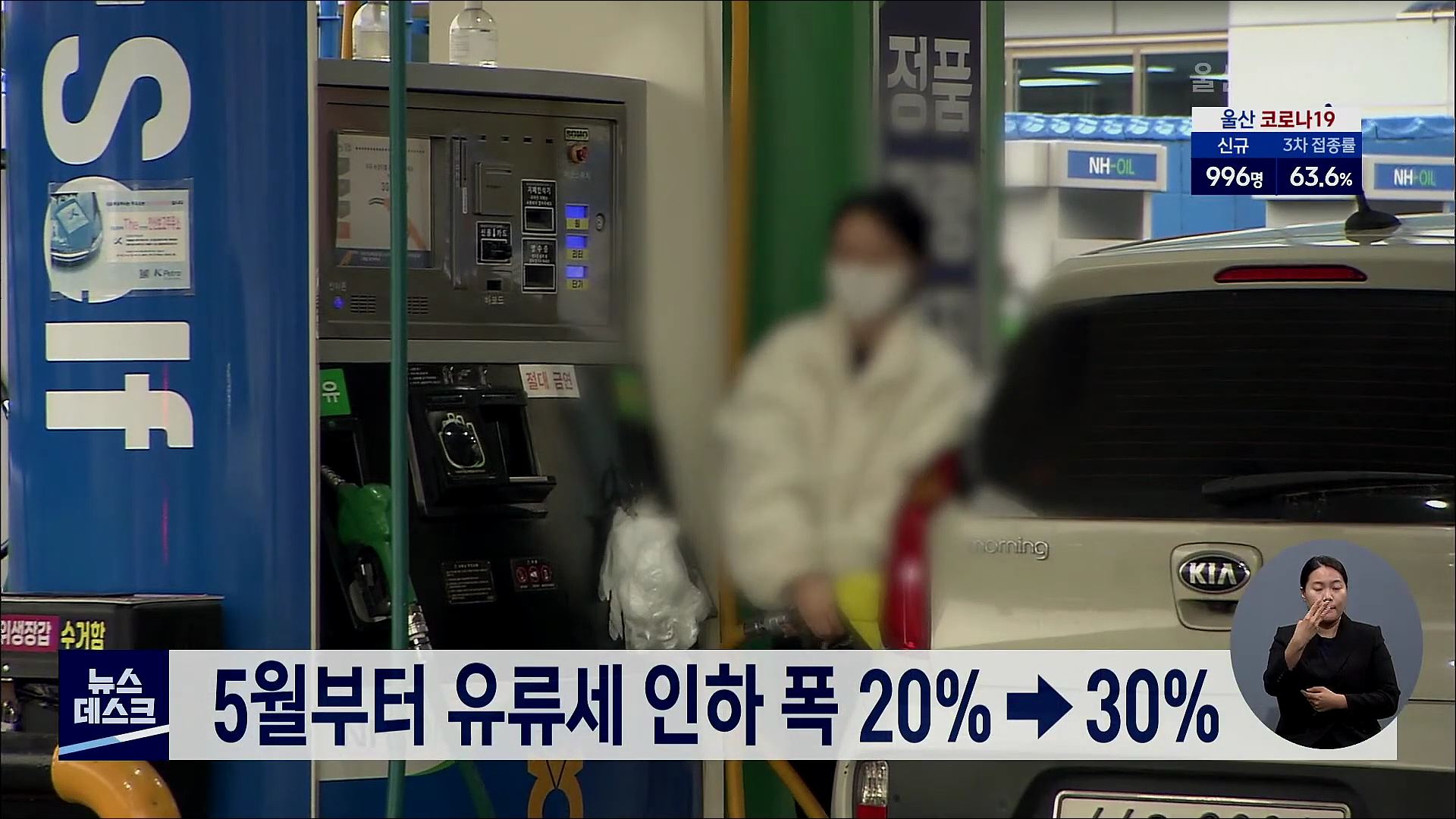 5월 1일부터 유류세 인하 폭이 현행 20%에서 30%로 확대됩니다. 유류세 인하분이 소비자가격에 그대로 반영된다고 가정하면 리터당 휘발유는 83원, 경유는 58원씩 가격이 내릴 전망입니다. 한국석유공사의 유가정보 사이트인 ‘오피넷’에 따르면 오늘(4/29) 오전 7시 기준 울산의 보통 휘발유 평균 판매가격은 1천948원입니...