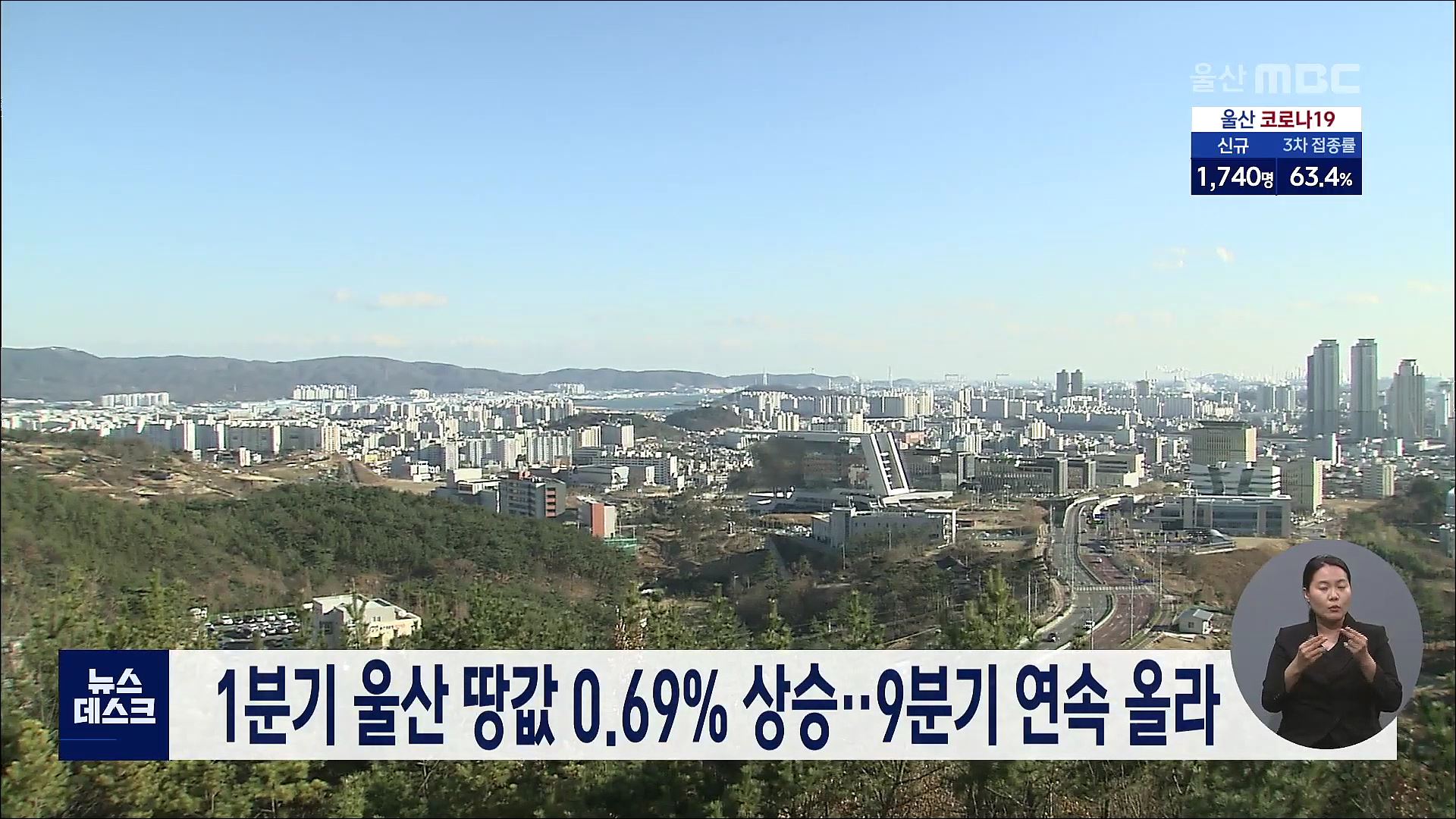 울산지역 땅 값이 9분기 연속 상승세를 보이고 있습니다. 국토교통부의 지가변동 추이에 따르면 올 1분기 울산지역 땅 값은 지난해 같은 기간에 비해 0.69% 상승해 지난 2020년 1/4분기 이후 9분기 연속 상승했습니다. 전국 광역시·도 가운데 지난 분기 대비 변동률이 확대된 곳은 울산과 경북 두 곳 뿐이지만 전국 평균 상...